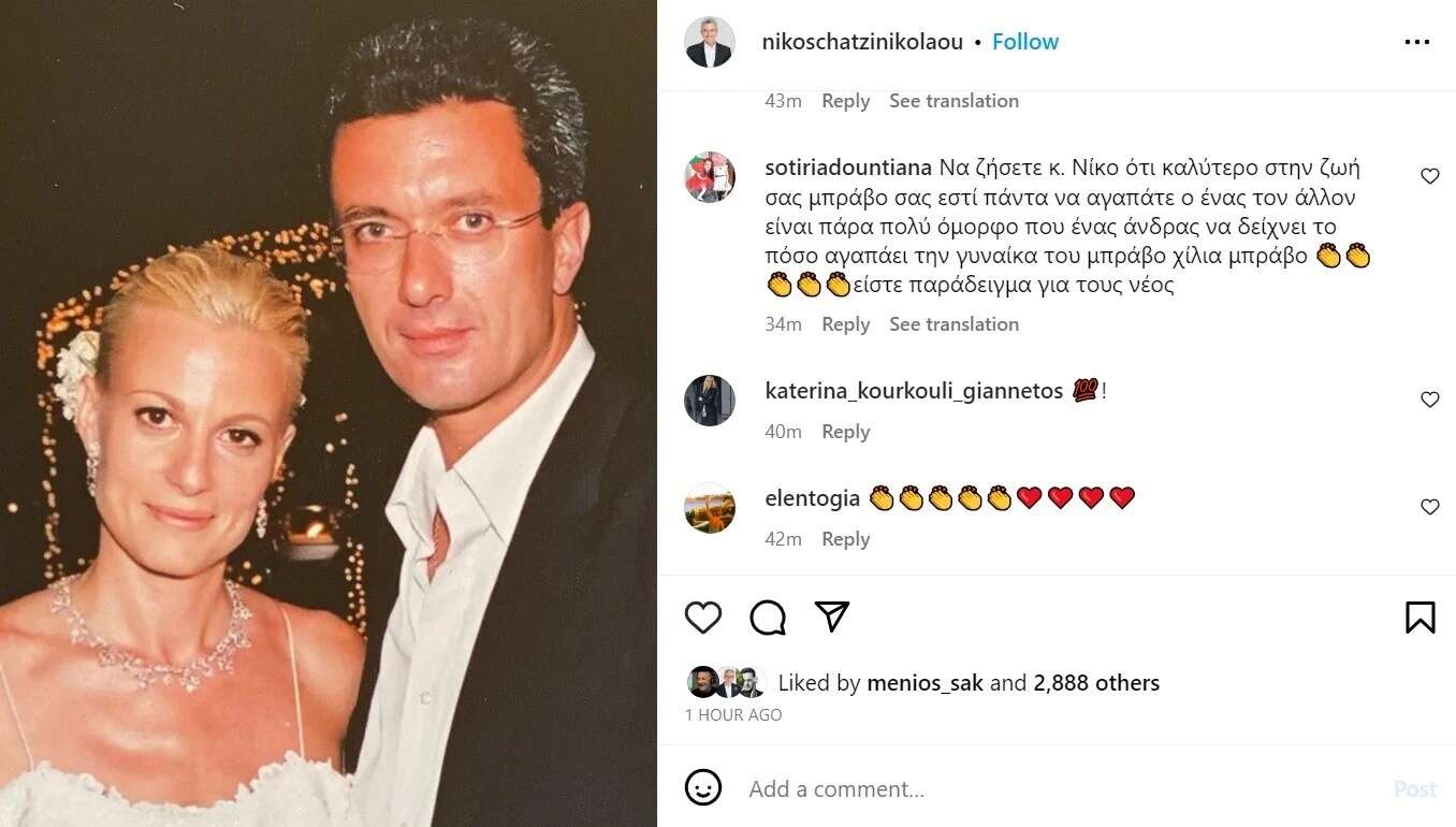 «19 χρόνια παντρεμένοι και 21 μαζί και σε λατρεύω όσο τότε και ακόμη περισσότερο! Ακόμη πιο βαθιά! Είσαι η ζωή μου!» ήταν τα λόγια του Νίκου Χατζηνικολάου.