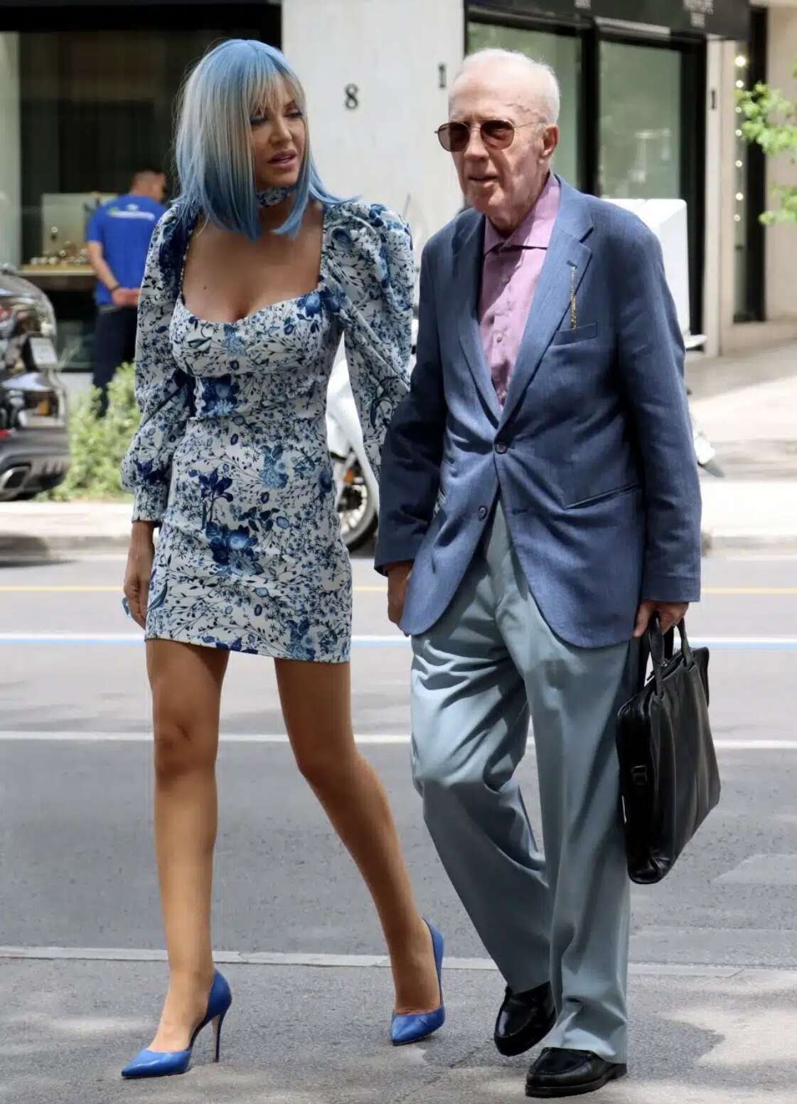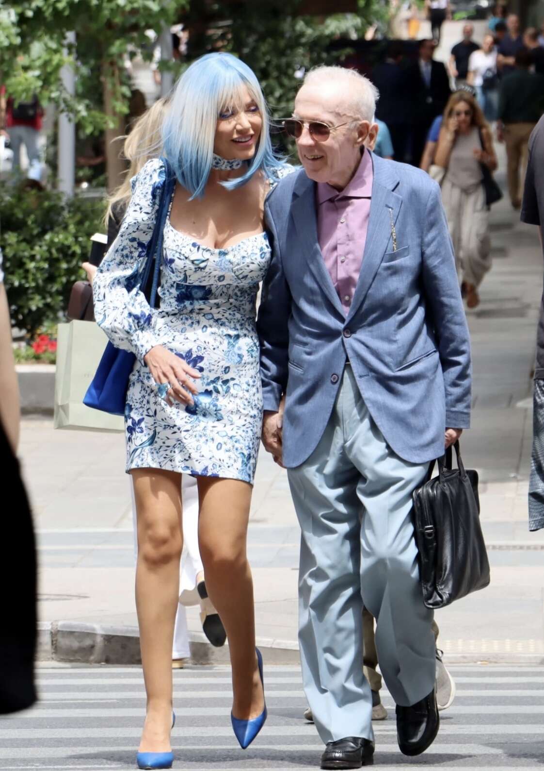 Το συνδύασε με μπλε πολύ εντυπωσιακές ψηλοτάκουνες γόβες. Mάλιστα ολοκλήρωσε την εμφάνιση με μπλε tote bag και περούκα σε bob καρέ με αφέλειες σε λευκές και γαλάζιες αποχρώσεις.