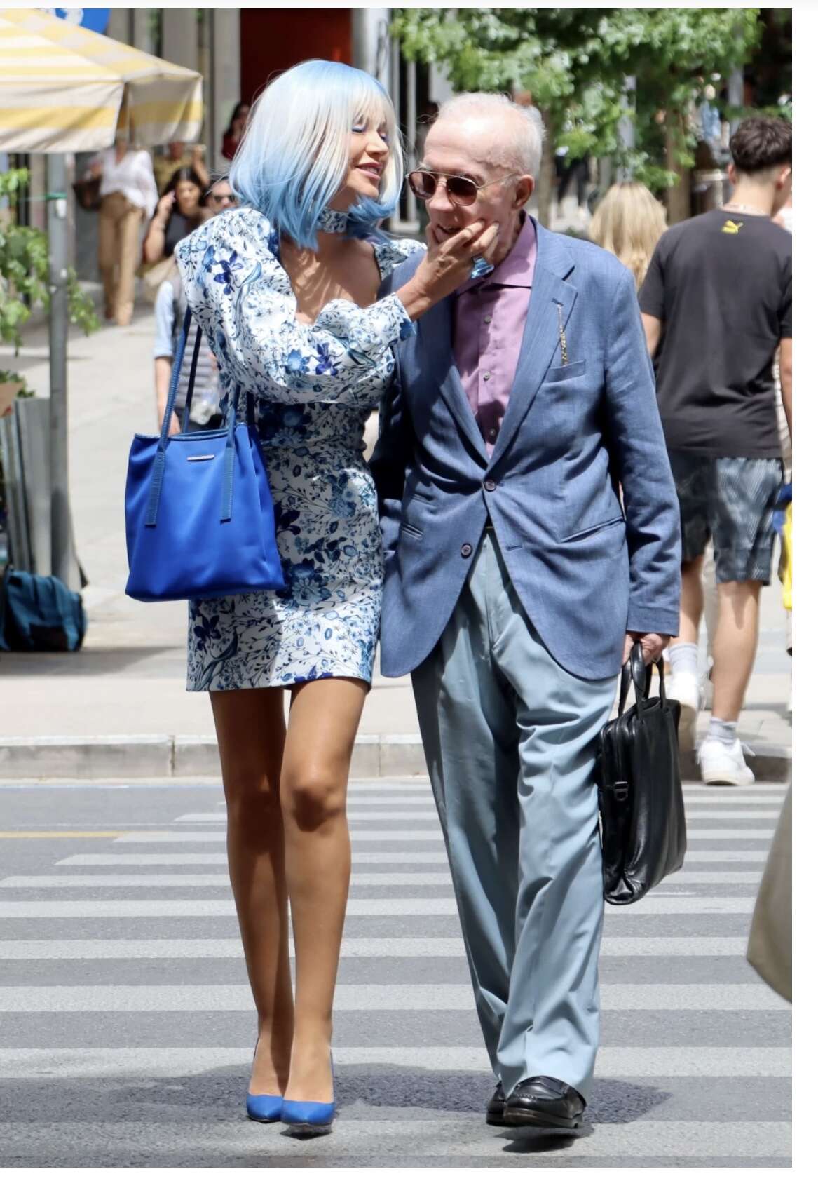 Το συνδύασε με μπλε πολύ εντυπωσιακές ψηλοτάκουνες γόβες. Mάλιστα ολοκλήρωσε την εμφάνιση με μπλε tote bag και περούκα σε bob καρέ με αφέλειες σε λευκές και γαλάζιες αποχρώσεις.