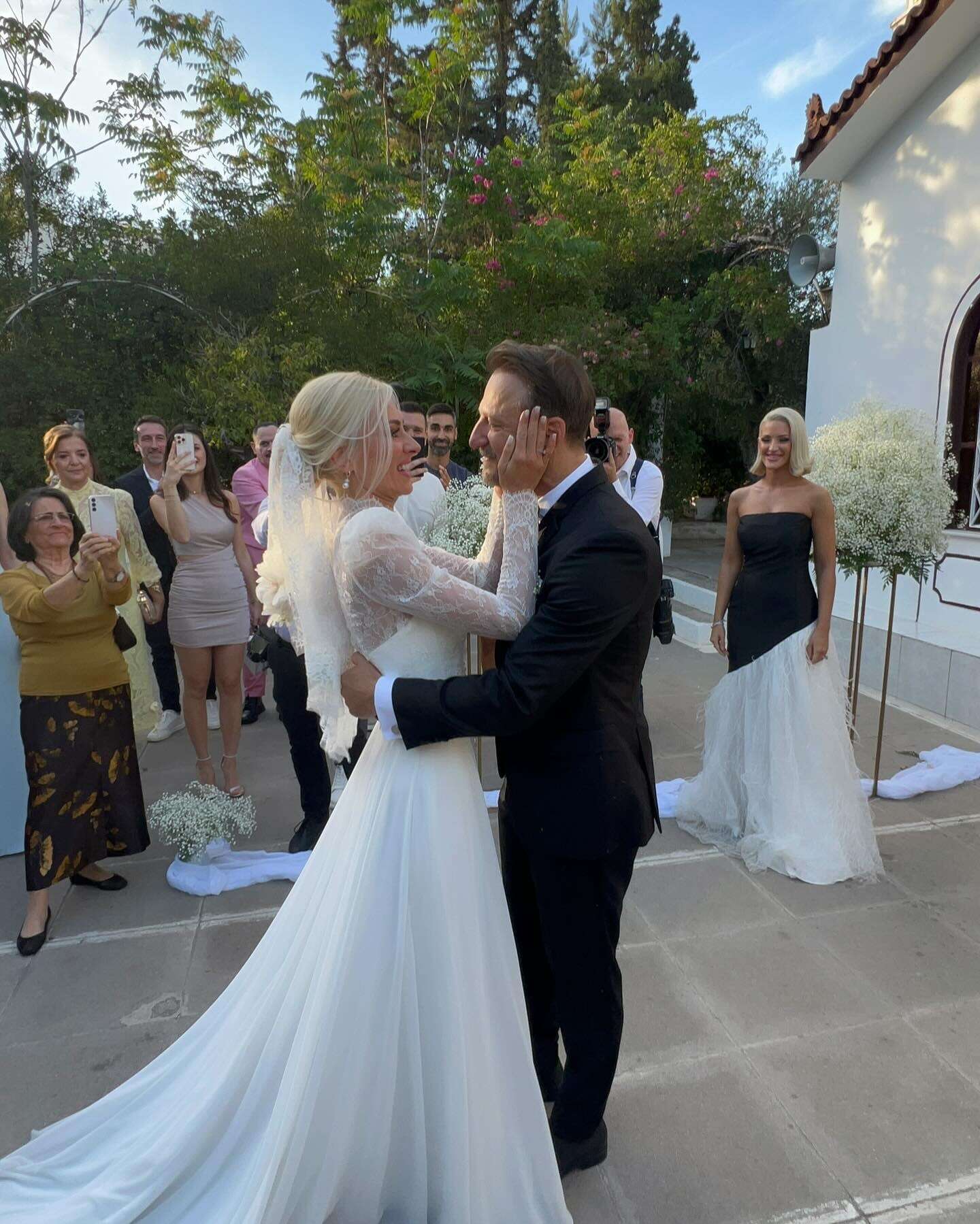 Η νύφη, Κάτια Μάνου, έλαμπε μέσα στο νυφικό της, ενώ ο Κώστας Καραφώτης δεν έκρυβε την ευτυχία του.