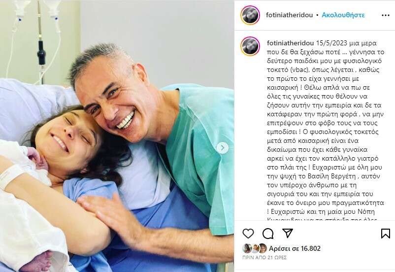«15/5/2023 μια μέρα που δε θα ξεχάσω ποτέ … γέννησα το δεύτερο παιδάκι μου με φυσιολογικό τοκετό (vbac), όπως λέγεται , καθώς το πρώτο το είχα γεννήσει με καισαρική! Θέλω απλά να πω σε όλες τις γυναίκες που θέλουν να ζήσουν αυτήν την εμπειρία και δε τα κατάφεραν την πρώτη φορά, να μην επιτρέψουν στο φόβο τους να τους εμποδίσει!», έγραψε η Φωτεινή Αθερίδου.
