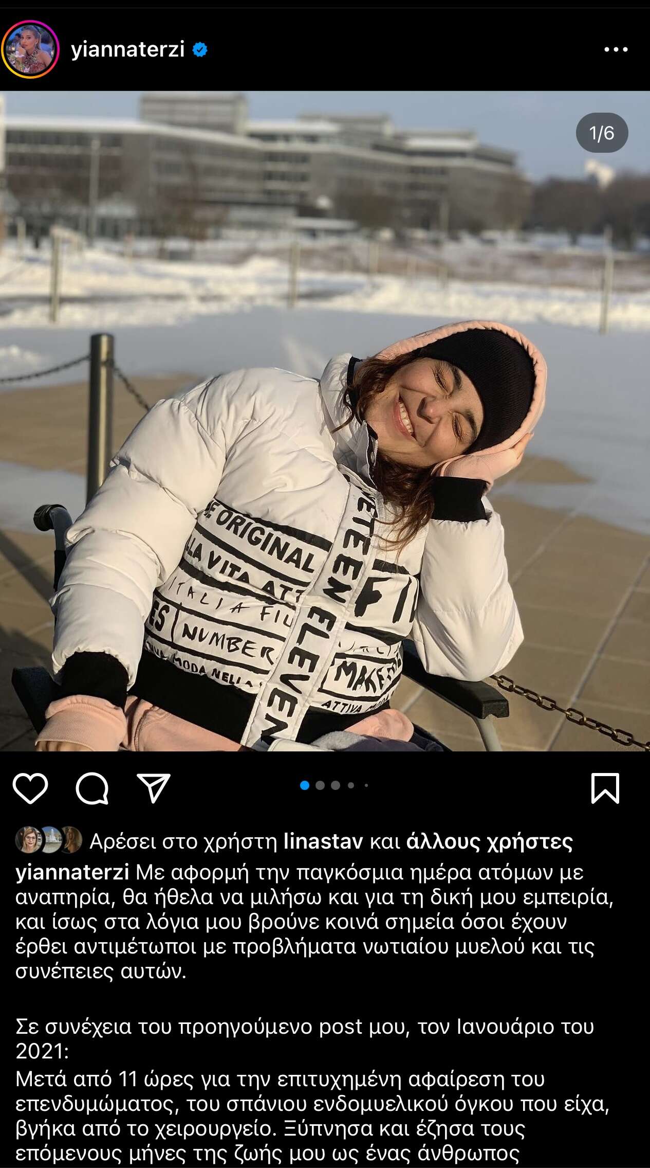 Την Κυριακή 3 Δεκεμβρίου, εν μέσω της Παγκόσμιας Ημέρας Ατόμων με Αναπηρία, μοιράστηκε μια φωτογραφία που την δείχνει να ποζάρει σε αναπηρικό αμαξίδιο, συνοδεύοντας τη με ένα μακροσκελές μήνυμα περιγράφοντας τη δική της εμπειρία.