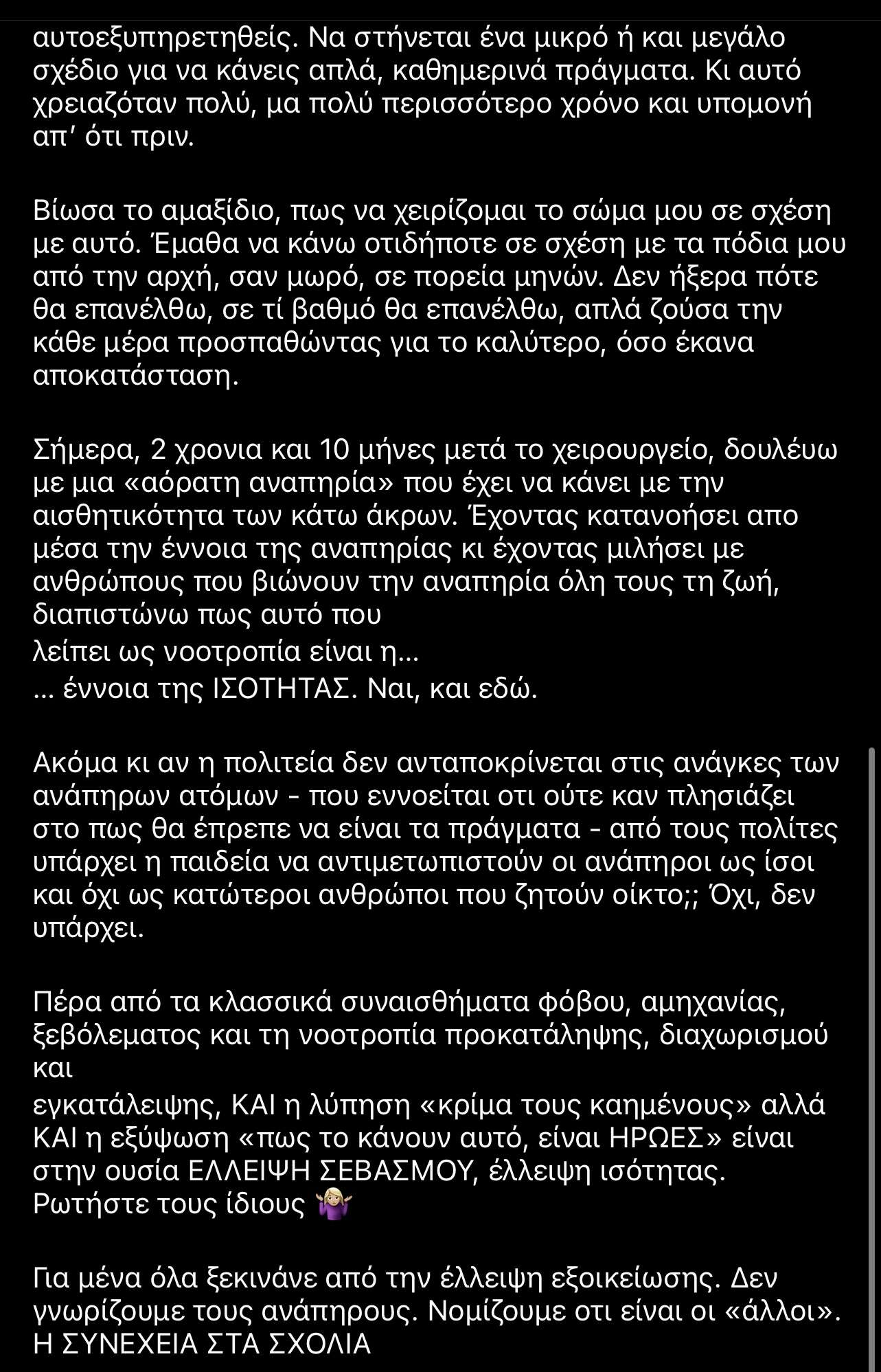Σήμερα, 2 χρόνια και 10 μήνες μετά το χειρουργείο, δουλεύω με μια «αόρατη αναπηρία» που έχει να κάνει με την αισθητικότητα των κάτω άκρων. Έχοντας κατανοήσει από μέσα την έννοια της αναπηρίας κι έχοντας μιλήσει με ανθρώπους που βιώνουν την αναπηρία όλη τους τη ζωή, διαπιστώνω πως αυτό που λείπει ως νοοτροπία είναι η… έννοια της ΙΣΟΤΗΤΑΣ. Ναι, και εδώ.