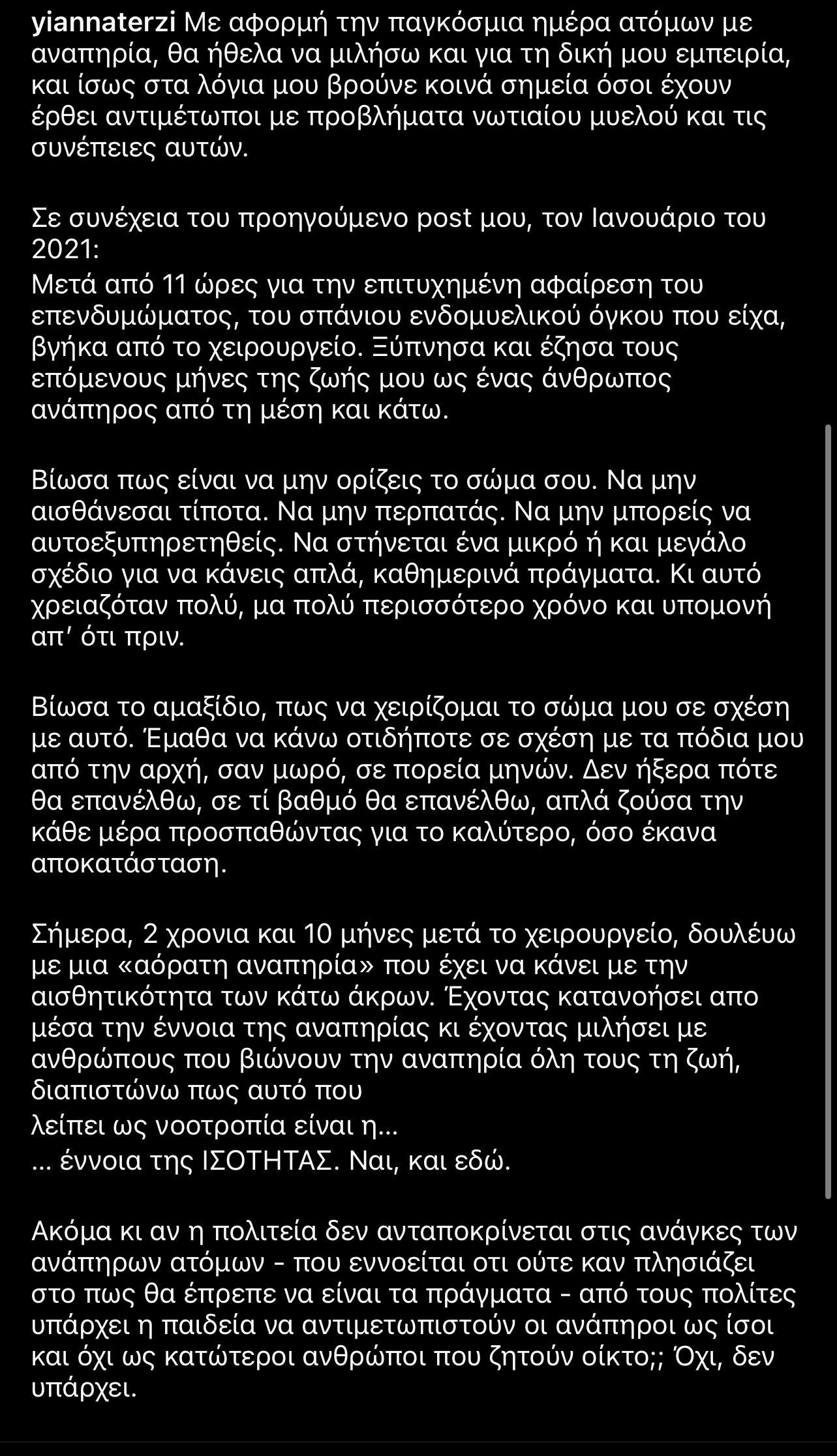 Πέρα από τα κλασσικά συναισθήματα φόβου, αμηχανίας, ξεβόλεματος και τη νοοτροπία προκατάληψης, διαχωρισμού και εγκατάλειψης, ΚΑΙ η λύπηση «κρίμα τους καημένους» αλλά ΚΑΙ η εξύψωση «πως το κάνουν αυτό, είναι ΗΡΩΕΣ» είναι στην ουσία ΕΛΛΕΙΨΗ ΣΕΒΑΣΜΟΥ, έλλειψη ισότητας. Ρωτήστε τους ίδιους Για μένα όλα ξεκινάνε από την έλλειψη εξοικείωσης. Δεν γνωρίζουμε τους ανάπηρους. Νομίζουμε ότι είναι οι “άλλοι”», έγραψε η Γιάννα Τερζή στην ανάρτησή της.