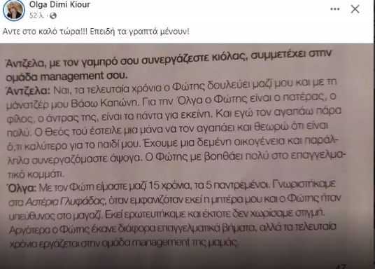Η Όλγα Κιουρτσάκη το μεσημέρι της Πέμπτης 1/2 προχώρησε σε μια νέα ανάρτηση όλο νόημα στον προσωπικό της λογαριασμό στο Instagram, στην οποία παρουσιάζει ένα απόσπασμα από παλαιότερη συνέντευξη που είχαν παραχωρήσεις και οι τρεις στο ίδιο περιοδικό. Στο συγκεκριμένο κομμάτι, η Άντζελα Δημητρίου είχε παραδεχτεί πως συνεργάζεται με τον Φώτη Λώση, ενώ είχε τονίσει πως είναι πολύ καλός σύντροφος για την κόρη της.