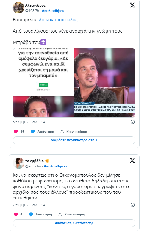 Μετά τις δηλώσεις του ο Νίκος Οικονομόπουλος έγινε θέμα συζήτησης στο Twitter, το οποίο παραδέχθηκε τον τραγουδιστή, ο οποίος είχε το θάρρος και εξέφρασε την αλήθεια του χωρίς να τον νοιάζει τι θα πει ο κόσμος. Εξέφρασε όσα πιστεύει με κάποιους «λίγους» να μην συμφωνούν και άλλους πάλι να τον επικροτούν που φρόντισε να πει όσα πρεσβεύει η πίστη του και ο ίδιος.