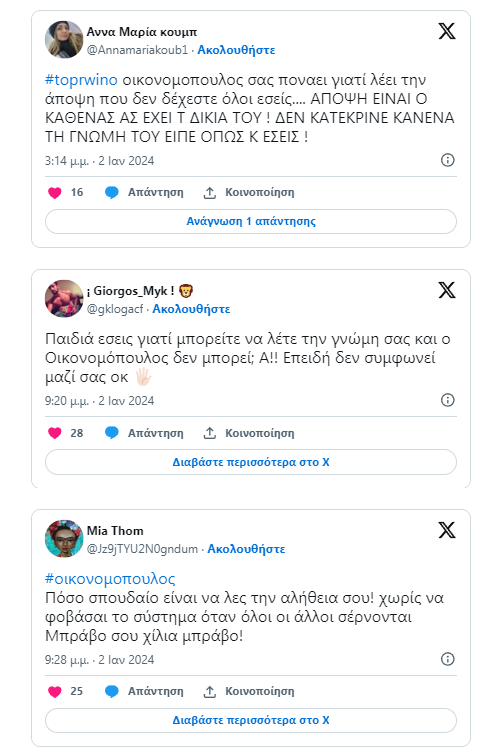 Μετά τις δηλώσεις του ο Νίκος Οικονομόπουλος έγινε θέμα συζήτησης στο Twitter, το οποίο παραδέχθηκε τον τραγουδιστή, ο οποίος είχε το θάρρος και εξέφρασε την αλήθεια του χωρίς να τον νοιάζει τι θα πει ο κόσμος. Εξέφρασε όσα πιστεύει με κάποιους «λίγους» να μην συμφωνούν και άλλους πάλι να τον επικροτούν που φρόντισε να πει όσα πρεσβεύει η πίστη του και ο ίδιος.
