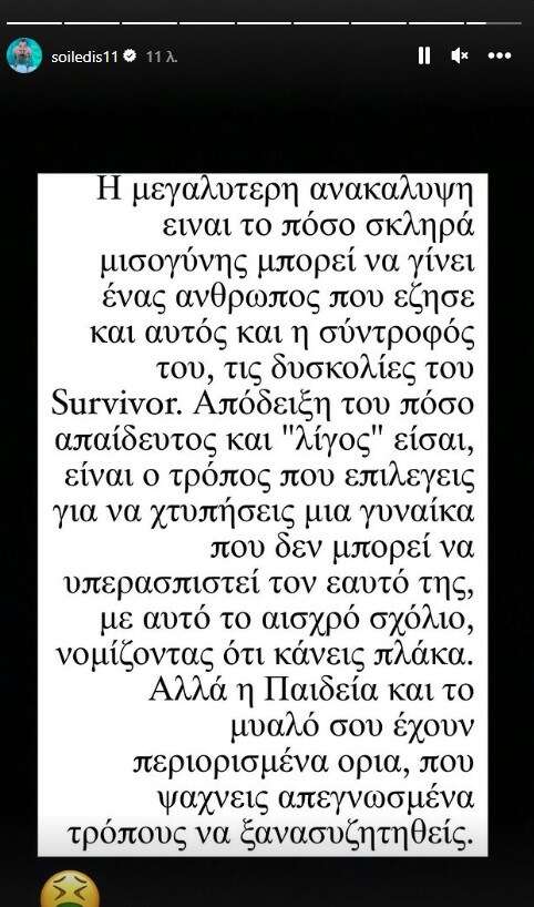 Για να απαντήσει ο Άρης Σοϊλέδης στον Σπύρο Μαρτίκα: «Η μεγαλύτερη ανακάλυψη είναι το πόσο σκληρά μισογύνης μπορεί να γίνει ένας άνθρωπος που έζησε και αυτός και η σύντροφός του τις δυσκολίες του Survivor. Απόδειξη του πόσο απαίδευτος και “λίγος” είσαι, είναι ο τρόπος που επιλέγεις για να χτυπήσεις μια γυναίκα που δεν μπορεί να υπερασπιστεί τον εαυτό της, με αυτό το αισχρό σχόλιο, νομίζοντας ότι κάνεις πλάκα. Αλλά η παιδεία και το μυαλό σου έχουν περιορισμένα όρια, που ψάχνεις απεγνωσμένα τρόπους να ξανασυζητηθείς»