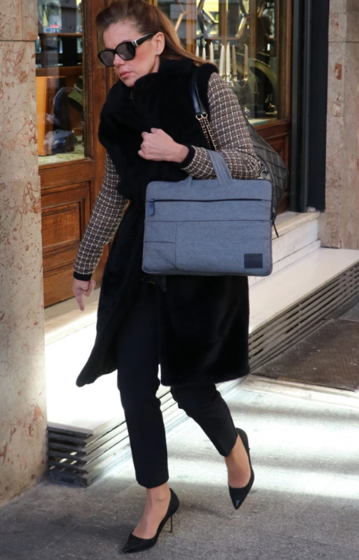 Η σύζυγος του Άδωνι Γεωργιάδη τη συνδύασε με μια tweed ζακέτα σε λευκό και μπεζ χρώμα, μαύρο παντελόνι και ψηλές γόβες.
