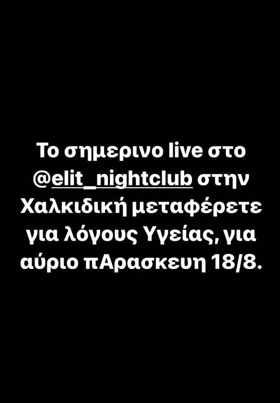 «Το σημερινό Live στη Χαλκιδική μεταφέρεται για λόγους υγείας, για αύριο Παρασκευή 18/8» υπογράμμισε ο Σνικ.