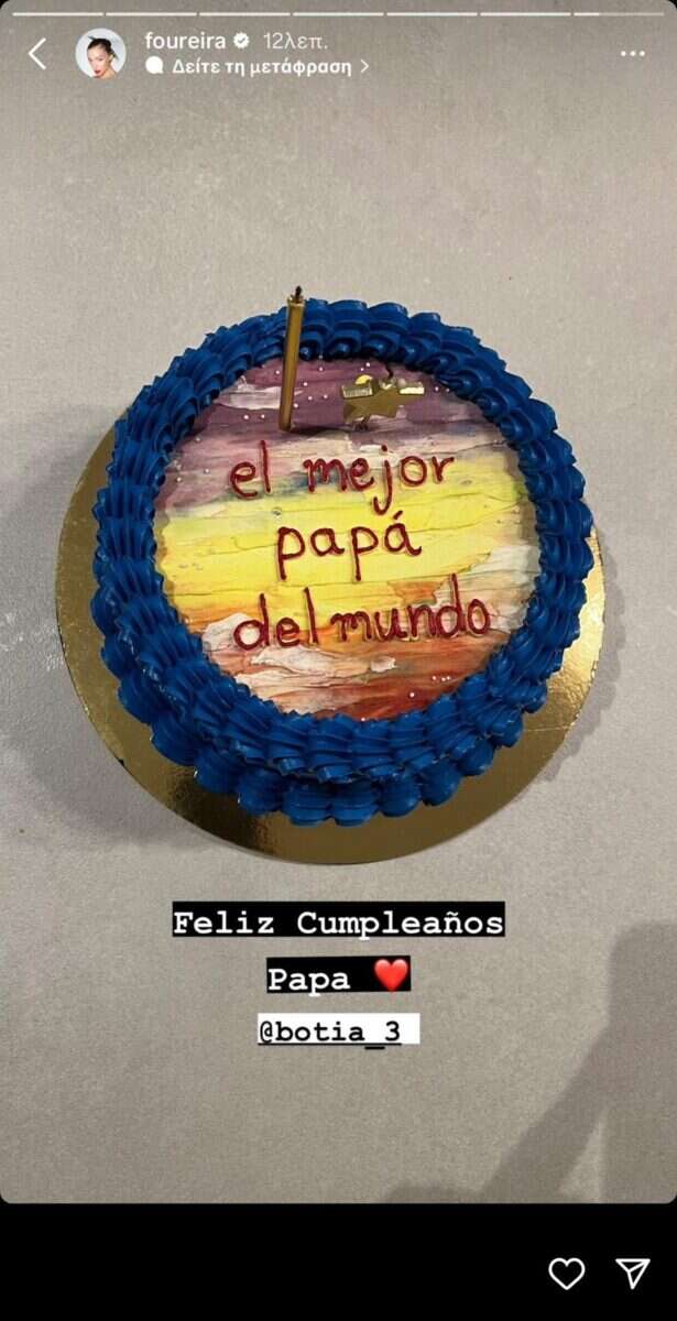 Συγκεκριμένα η τούρτα, της οποίας φωτογραφία μοιράστηκε η Ελένη Φουρέιρα με τους διαδικτυακούς της φίλους ανέφερε χαρακτηριστικά στην ισπανική γλώσσα: «Ο καλύτερος μπαμπάς του κόσμου».