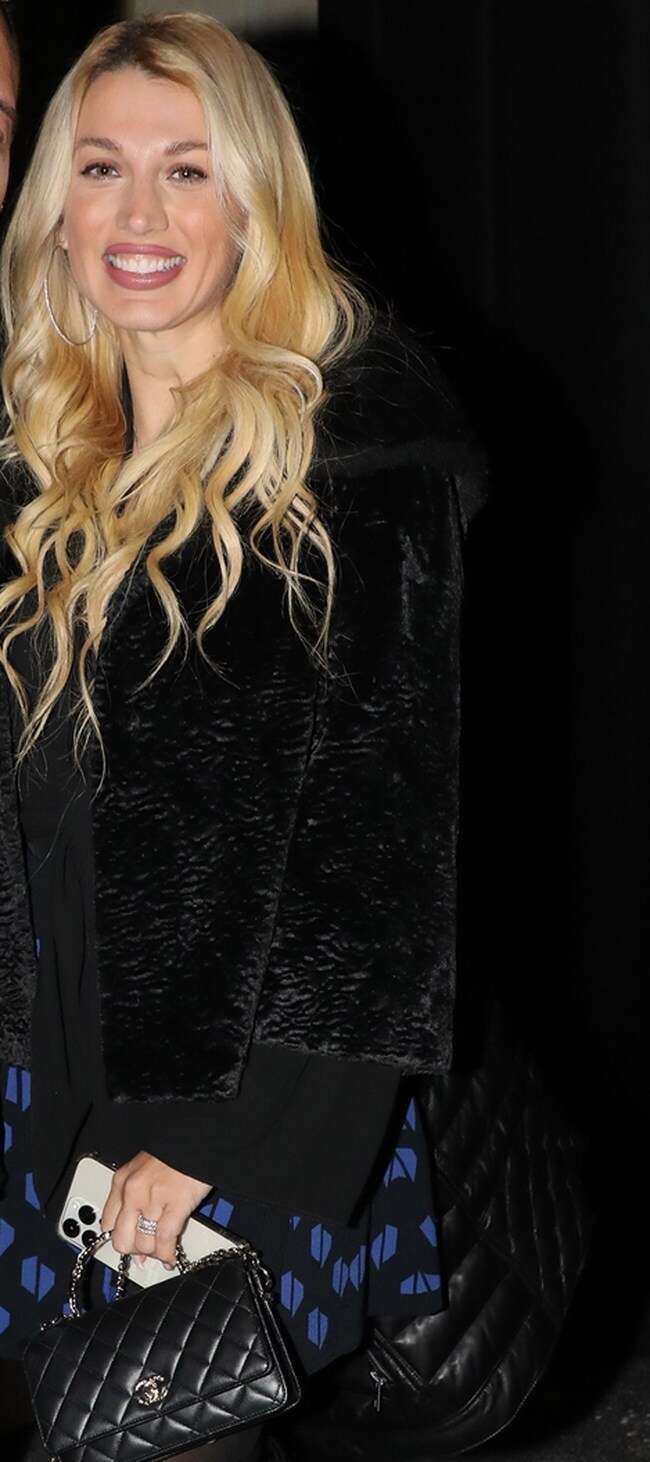 Την εμφάνισή της ολοκλήρωσε με ένα κοντό γουνάκι με κουκούλα, το οποίο δεν ήταν η καλύτερη επιλογή για μια βραδινή έξοδο, καθώς ήταν σε μήκος που δεν ταίριαζε με το φόρεμά της.