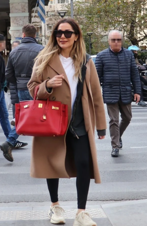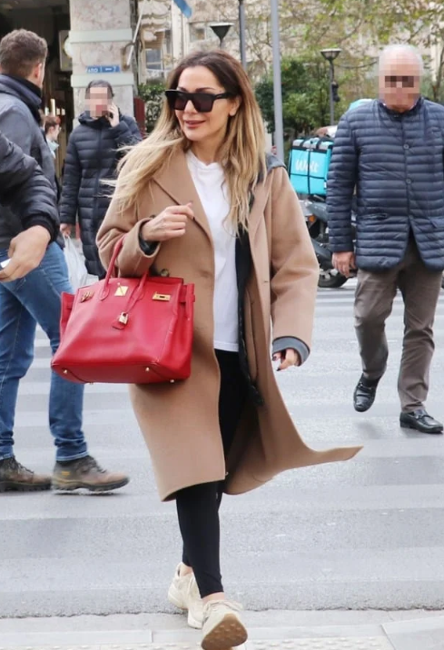 Συγκεκριμένα φόρεσε ένα αθλητικό κολάν, ένα λευκό τοπ, ένα καμηλό παλτό και σνίκερς. Αλλά το item που έσπασε τη μονοτονία ήταν η κόκκινη Hermes τσάντα της αξίας 15.000 ευρώ!