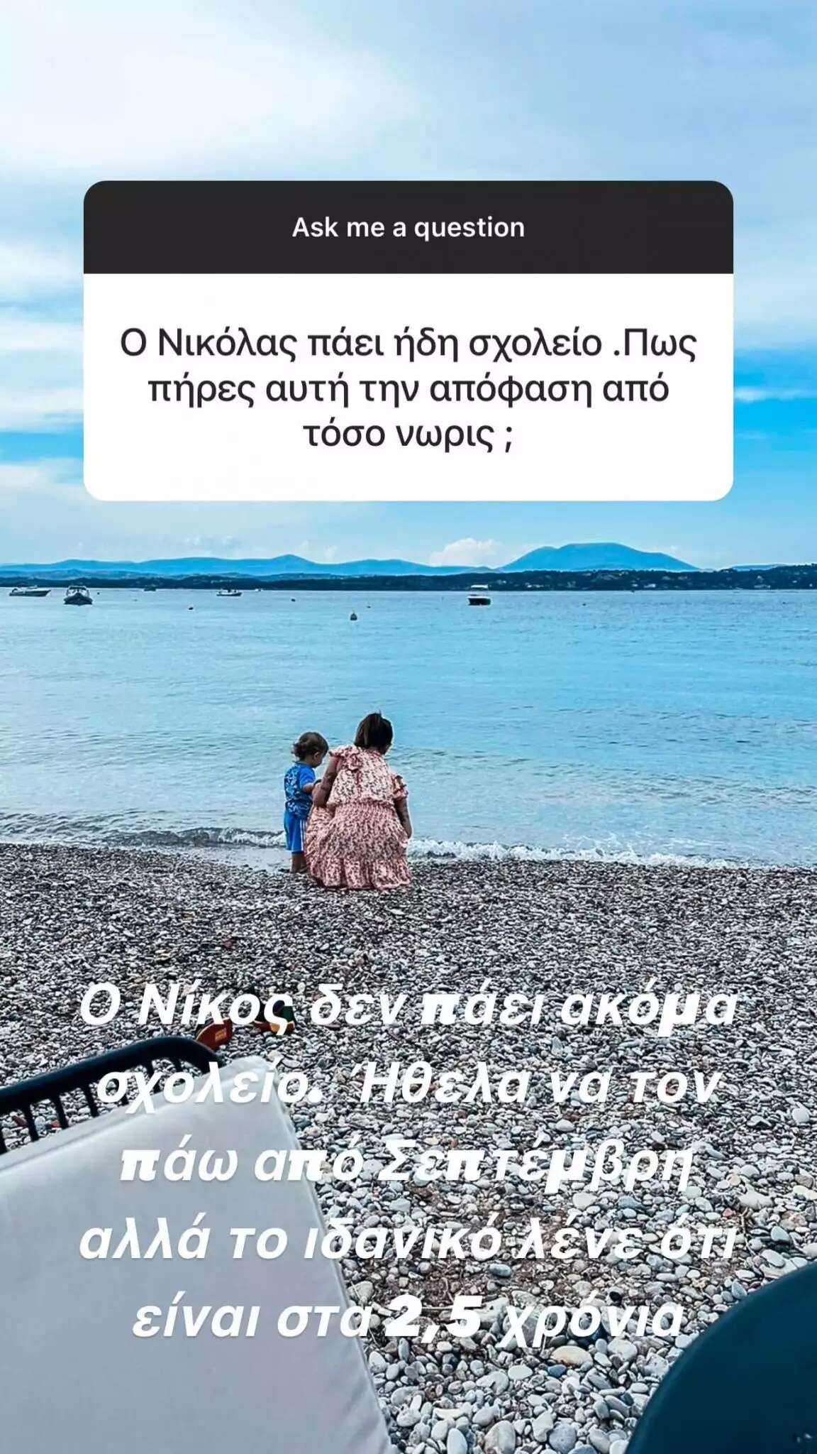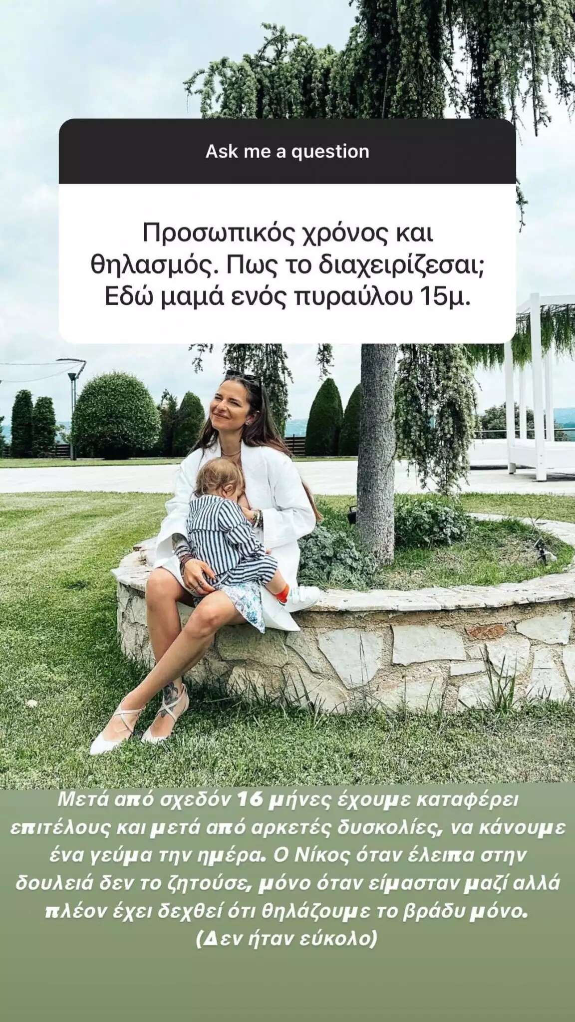 «Μετά από 16 μήνες έχουμε καταφέρει επιτέλους και μετά από αρκετές δυσκολίες, να κάνουμε ένα γεύμα την ημέρα. Ο Νίκος όταν έλειπα στη δουλειά δεν το ζητούσε, μόνο όταν ήμασταν μαζί αλλά πλέον έχει δεχθεί ότι θηλάζουμε το βράδυ μόνο (δεν ήταν εύκολο)» ανέφερε η Εριέττα Κούρκουλου, ενώ σε άλλη ερώτηση για τον γιο της έγραψε, «Ο Νίκος δεν πάει ακόμα σχολείο. Ήθελα να τον πάω από Σεπτέμβρη αλλά το ιδανικό λένε ότι είναι μετά τα 2,5 χρόνια».