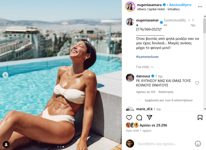 Το καλογυμνασμένο σώμα της και οι εντυπωσιακοί κοιλιακοί της, τράβηξαν τα βλέμματα και μονοπώλησαν τα σχόλια των followers της. “Λυπήσου μας και εμάς τους κοινούς θνητούς”, “Τέτοιους κοιλιακούς δεν θα έχουμε ποτέ”, “Βρε Σαμαρά, τι φέτες είναι αυτές;”, “Μόνο τα θεϊκά αγάλματα έχουν τέτοια κορμιά . Θεϊκο κορμί έχει η Ευγενία μας”, έγραφαν κάποια από τα σχόλια μας.