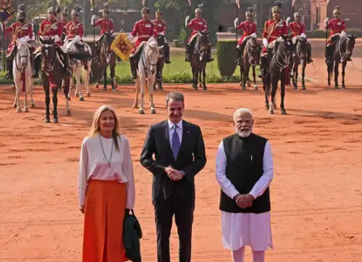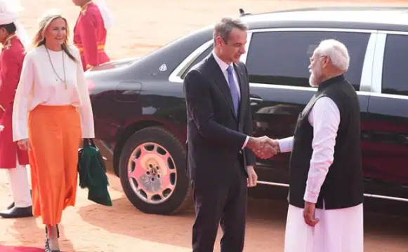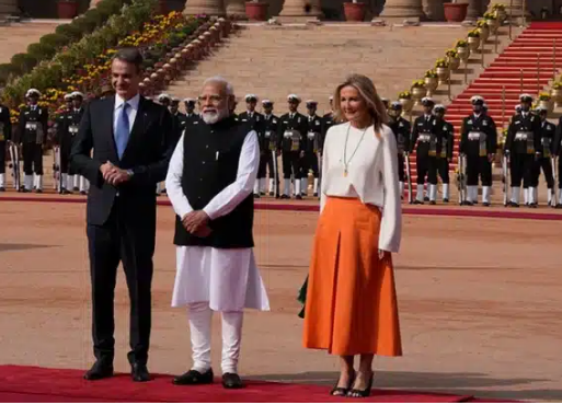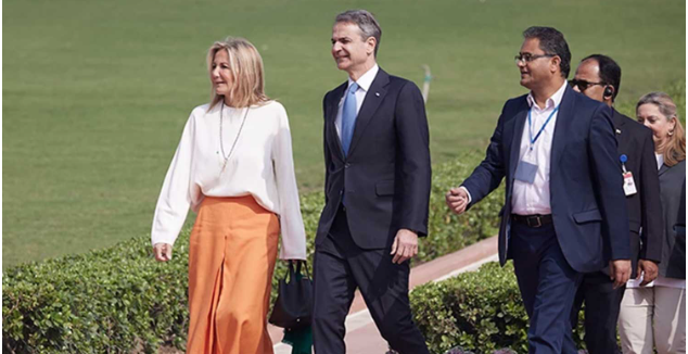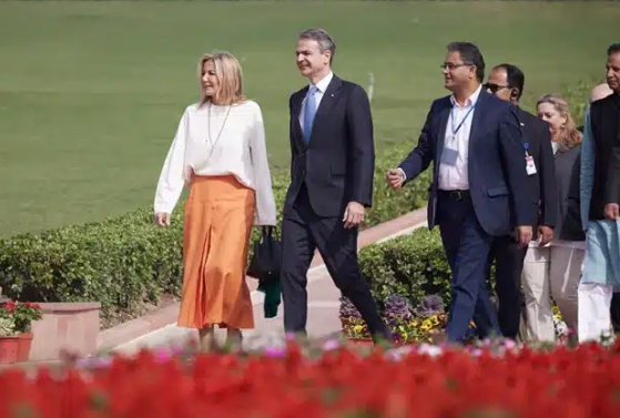 Ο Κυριάκος Μητσοτάκης βρίσκεται στο Νέο Δελχί στο πλαίσιο επίσημης επίσκεψης στην Ινδία. Τον έλληνα πρωθυπουργό συνοδεύει στο ταξίδι η σύζυγός του, Μαρέβα, η οποία τράβηξε τα βλέμματα με την κομψή και συμβολική εμφάνισή της.