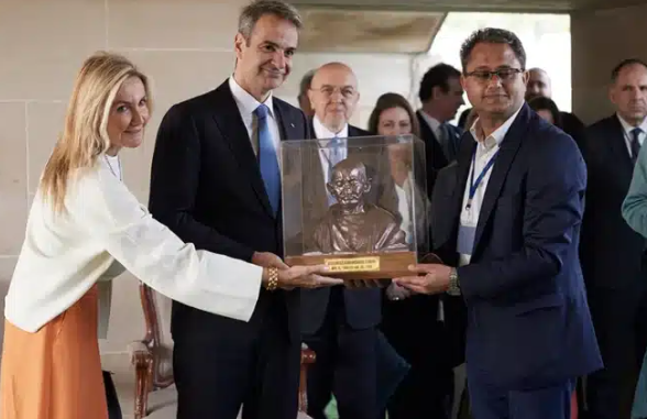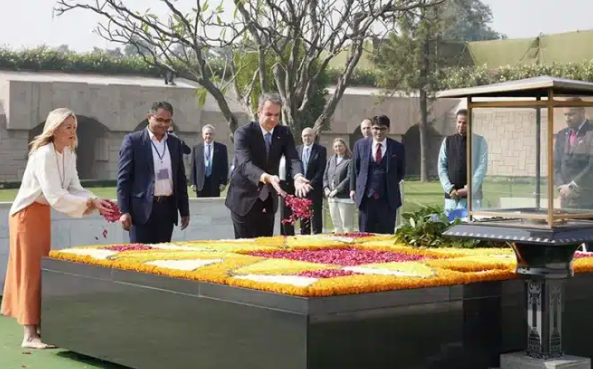 Η Μαρέβα Μητσοτάκη, πάλι, δεν το έκανε τόσο πολύπλοκο, αλλά σίγουρα ήταν επιτυχημένη η κίνησή της, αποσπώντας φιλοφρονήσεις για το ντύσιμό της. Το πρωθυπουργικό ζεύγος κατέθεσε στεφάνι στο μνημείο του Μαχάτμα Γκάντι και άφησαν το δικό τους μήνυμα στο βιβλίο επισκεπτών. Συμμετείχαν, επίσης, και σε μία παραδοσιακή τελετή με λουλούδια, με την κυρία Μητσοτάκη να βγάζει -προφανώς ως είθισται- τα παπούτσια της.