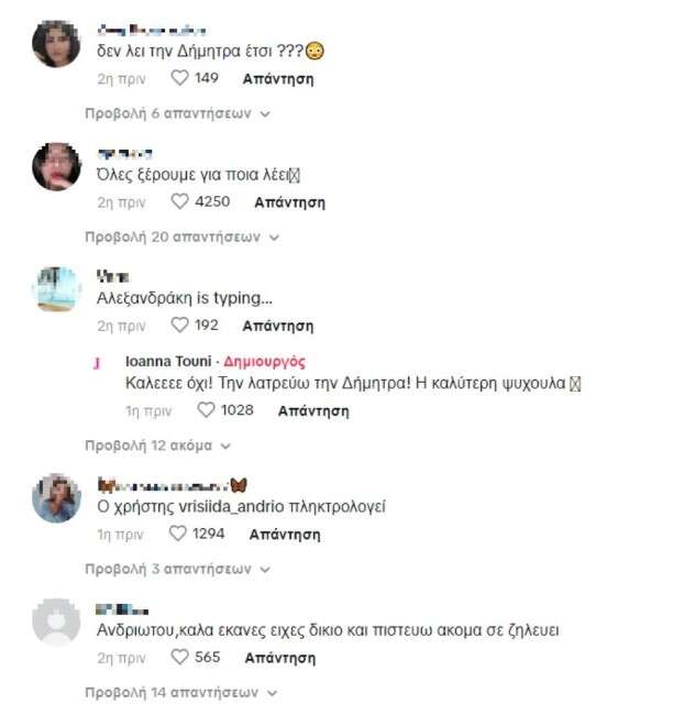 Αυτό αμέσως κίνησε υποψίες, με τους ακόλουθούς της να αναρωτιούνται στα σχόλια σε ποιον απευθύνεται αυτή η σπόντα. Μερικοί ρώτησαν για την Δήμητρα Αλεξάνδράκη, με την οποία δεν βρίσκεται πολύ συχνά πια, αλλά έχουν εξηγήσει πως δεν έχει αλλάξει κάτι μεταξύ τους και πως όλο αυτό συμβαίνει λόγο του ελάχιστου ελεύθερου χρόνου που διαθέτουν. Γι’ αυτό και η ίδια απάντησε ξανά: «Καλεεεε όχι! Την λατρεύω την Δήμητρα! Η καλύτερη ψυχούλα».