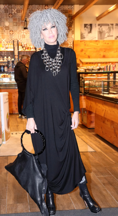 Τα φυσικά μαλλιά της είναι μακριά και γκρίζα.