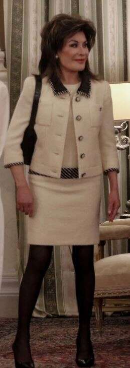 Για την πρωτοχρονιάτικη εμφάνισή της η Γιάννα Αγγελοπούλου φόρεσε ένα μίνι φόρεμα με ασορτί σακάκι τύπου Chanel σε κρεμ και μαύρο.