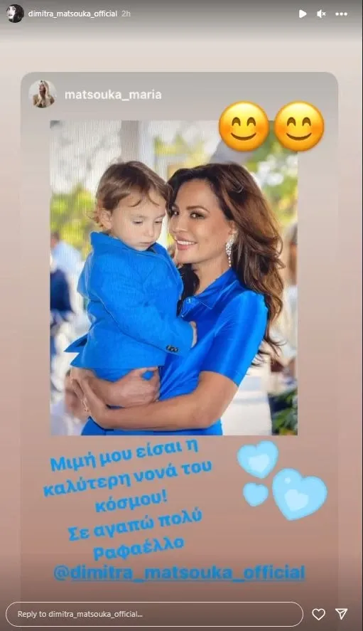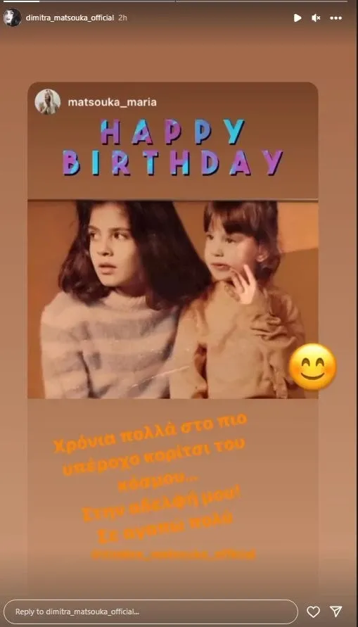 Η αδερφή της Δήμητρας Ματσούκα, Μαρία Ματσούκα, ευχήθηκε στην ηθοποιό για τα γενέθλιά της μέσα από τα social media, κοινοποιώντας μια φωτογραφία τους από τα παιδικά τους χρόνια και μία από τη βάπτιση του γιου της, καθώς η Δήμητρα Ματσούκα ήταν η νονά του μικρού.