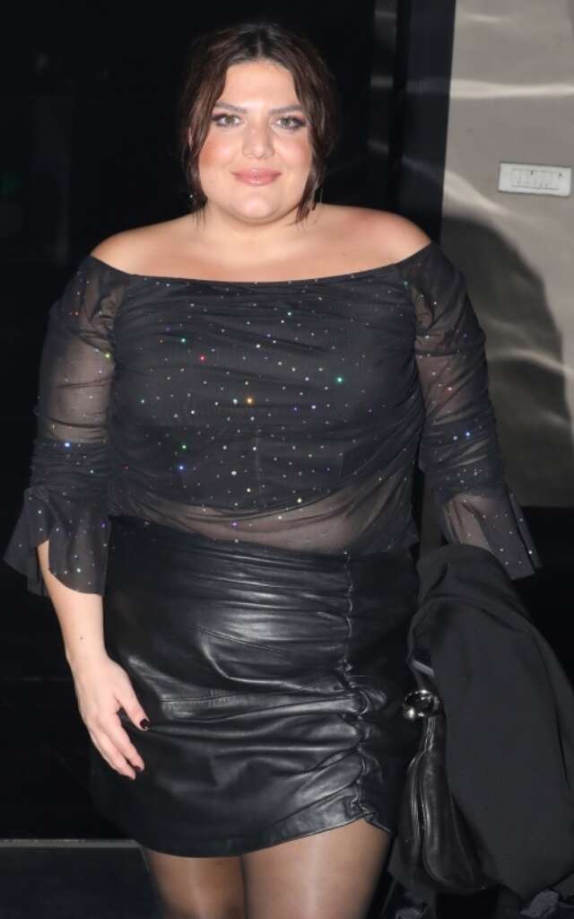 Η παρουσιάστρια επέλεξε ένα διαφανές τοπ και μίνι δερμάτινη φούστα, ενώ οι δύο ηθοποιοί φόρεσαν από ένα μακρύ μαύρο φόρεμα. Διασκέδασαν χορεύοντας τα τραγούδια των καλλιτεχνών και πίνοντας το ποτό τους.