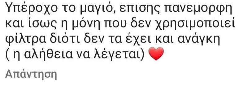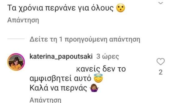 μια follower σχολίασε το εξής: «Τα χρόνια περνάνε για όλους». Η Κατερίνα Παπουτσάκη, ωστόσο απάντησε με ψυχραιμία σε αυτό το σχόλιο γράφοντας: «Κανείς δεν το αμφισβητεί αυτό. Καλά να περνάς».