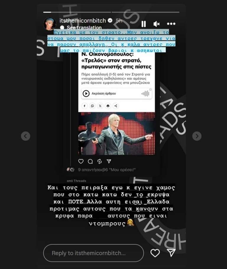«Σχετικά με τον στρατό… Μην ανοίξω το στόμα μου πόσοι δήθεν άντρες τρέχανε για να πάρουν απαλλαγή… Οι και καλά άντρες που μας το παίζουν βαριοί και ασήκωτοι. Και τους πείραξα εγώ και έγινε χαμός που στο κάτω κάτω δεν το έκρυψα ΠΟΤΕ… Αλλά αυτή είναι Ελλάδα προτιμάς αυτούς που τα κάνουν στα κρυφά παρά αυτούς που είναι ντόμπρους»