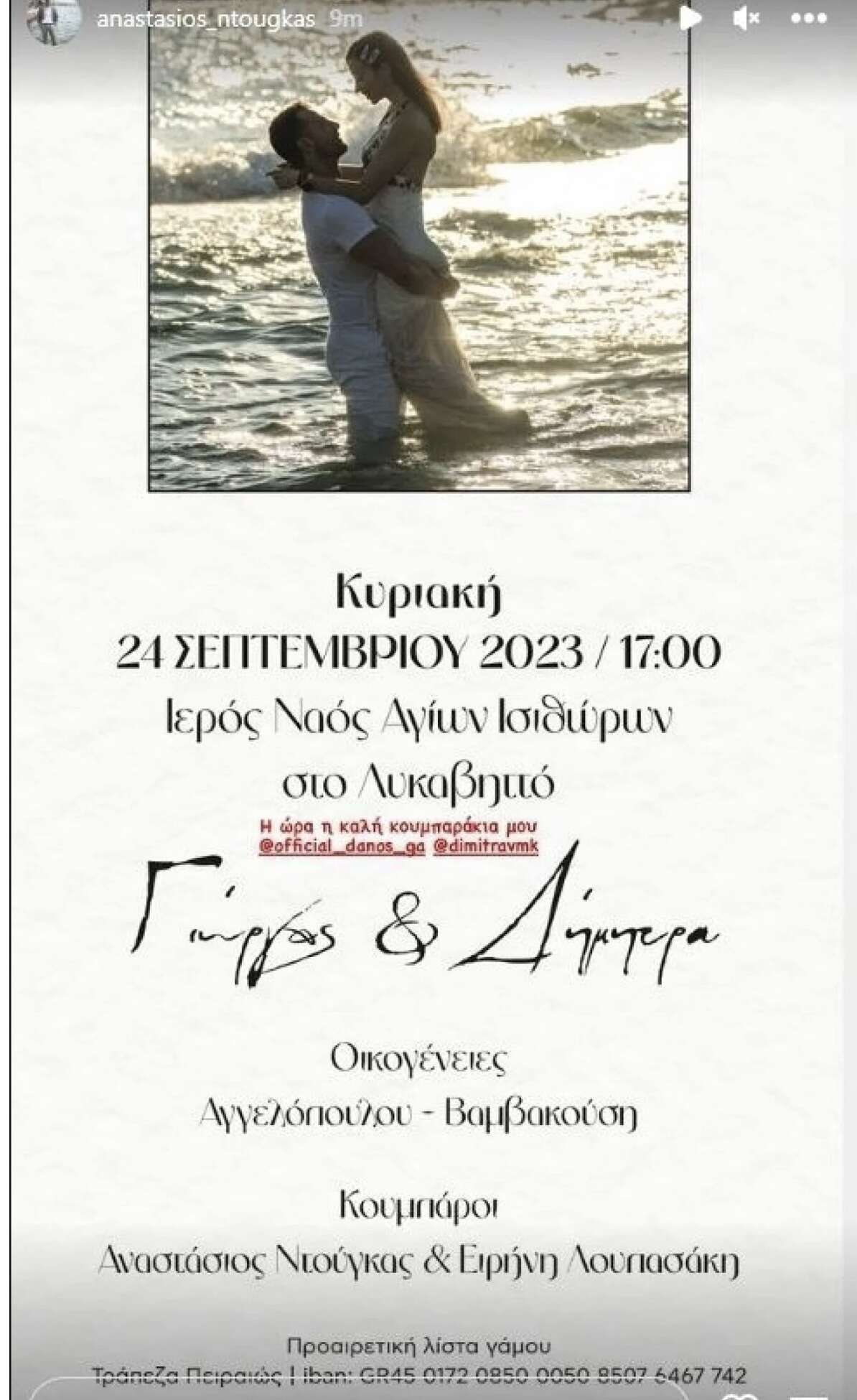 Ο ίδιος ένα story στον προσωπικό του λογαριασμό στο Instagram με το προσκλητήριο του γάμου του ζευγαριού, ο οποίος θα πραγματοποιηθεί στις 24 Σεπτεμβρίου στην Αθήνα.