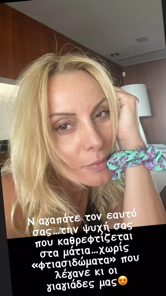 «Να αγαπάτε τον εαυτό σας. Την ψυχή σας που καθρεφτίζεται στα μάτια, χωρίς “φτιασιδώματα” που λέγανε και οι γιαγιάδες μας» έγραψε η Πέγκυ Ζήνα.