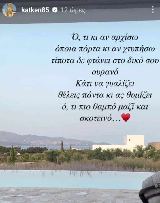 Αυτό έκανε και χθες αργά το απόγευμα σε story της με μια φωτογραφία από το μέρος που μένει στο νησί, μόνο που αυτή τη φορά χρησιμοποίησε τους στίχους από το τραγούδι του Βασίλη Καζούλη «Κάτι να γυαλίζει». Η ίδια έγραψε, λοιπόν: «Ό,τι κι αν αρχίσω, όποια πόρτα κι αν χτυπήσω, τίποτα δε φτάνει στο δικό σου ουρανό. Κάτι να γυαλίζει θέλεις πάντα κι ας θυμίζει ό,τι πιο θαμπό μαζί και σκοτεινό…», προσθέτοντας και το emoji καρδούλα στο τέλος. Ίσως αυτή η ανάρτηση να ήταν αφιερωμένη σε κάποιον ανεκπλήρωτο έρωτα ή σε κάποιον καινούργιο.