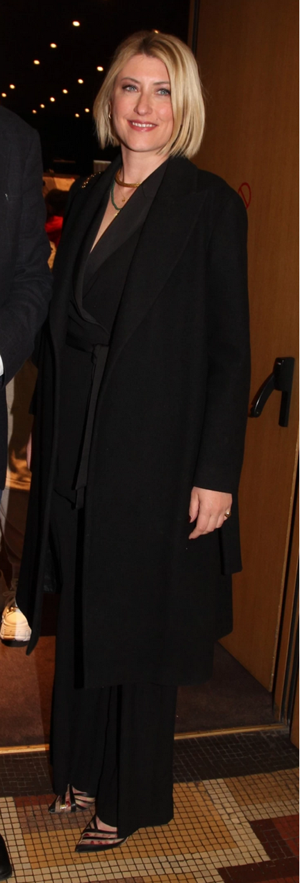 Η σύζυγος του Κώστα Μπακογιάννη και παρουσιάστρια του κεντρικού δελτίου ειδήσεων του ΣΚΑΪ επέλεξε ένα total black σετ και παλτό το οποίο συνδύασε με ιδιαίτερες γόβες με διάφανες ρίγες.