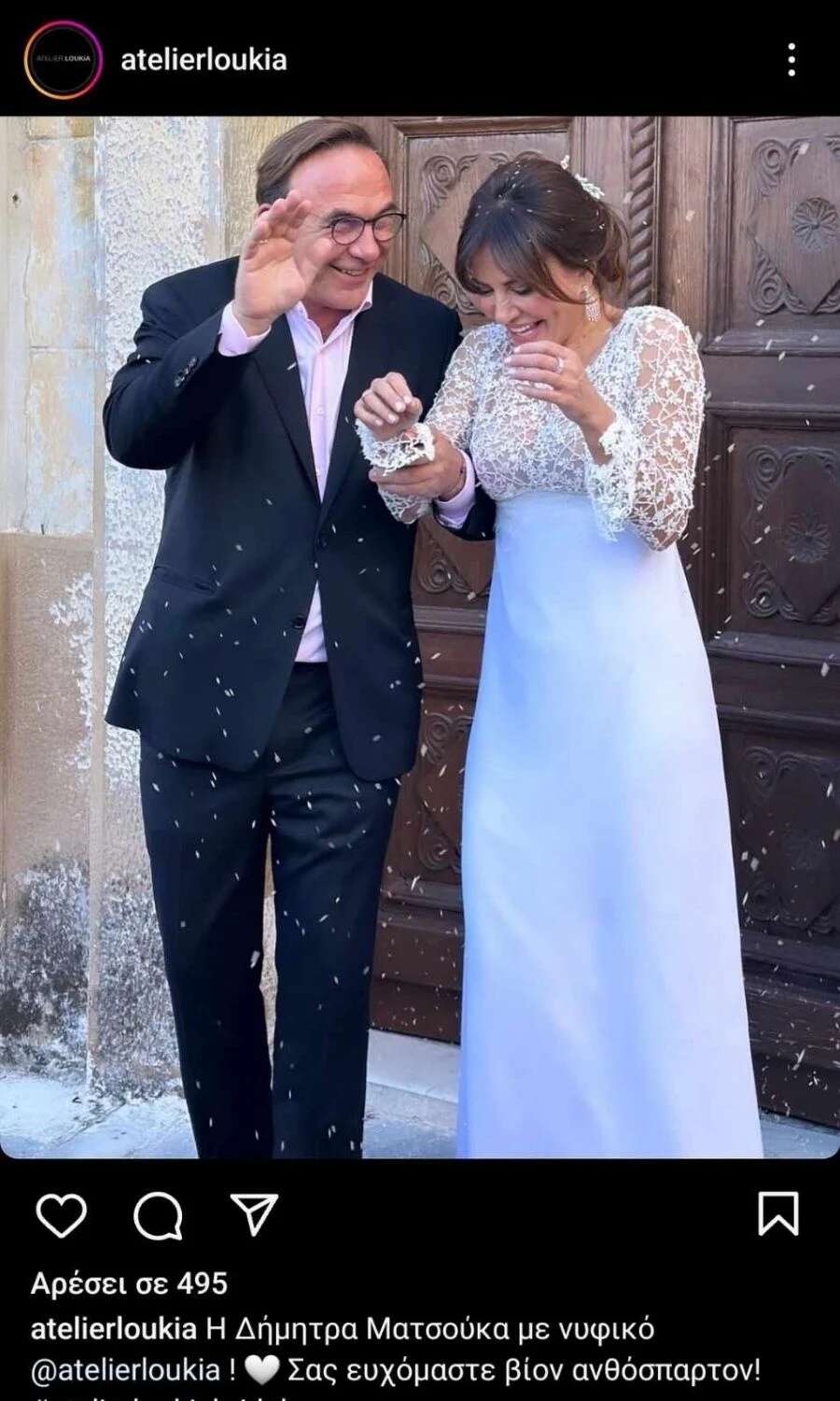 Η Δ. Ματσούκα έλαμπε με το απλό και εντυπωσιακό ολόλευκο νυφικό της. Επέλεξε ένα νυφικό σε στυλ γοργόνας με δαντέλα από το κατάστημα «Atelier Λουκία», ενώ τα μαλλιά της ήταν πιασμένα σε έναν όμορφο κότσο.