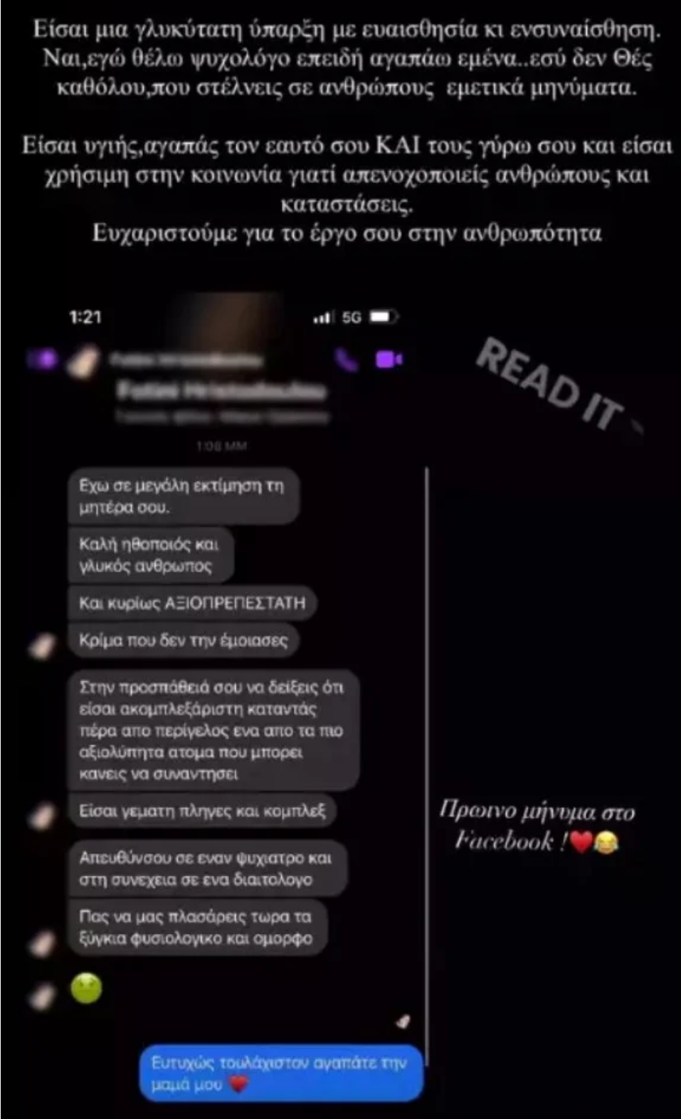 «Φωτεινή, είσαι μια γλυκύτατη ύπαρξη με ευαισθησία και ενσυναίσθηση. Ναι, εγώ θέλω ψυχολόγο, επειδή αγαπάω εμένα… εσύ δεν θες καθόλου που στέλνεις σε ανθρώπους εμετικά μηνύματα.
