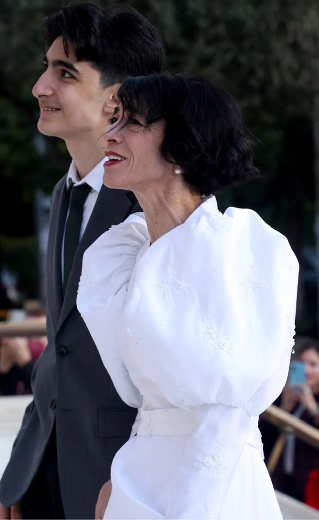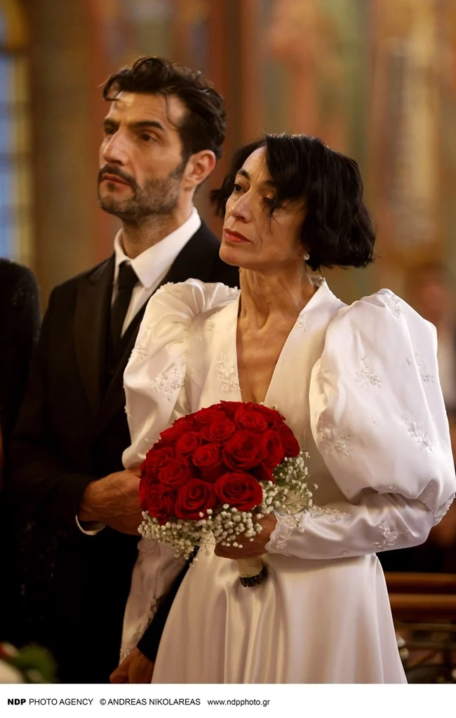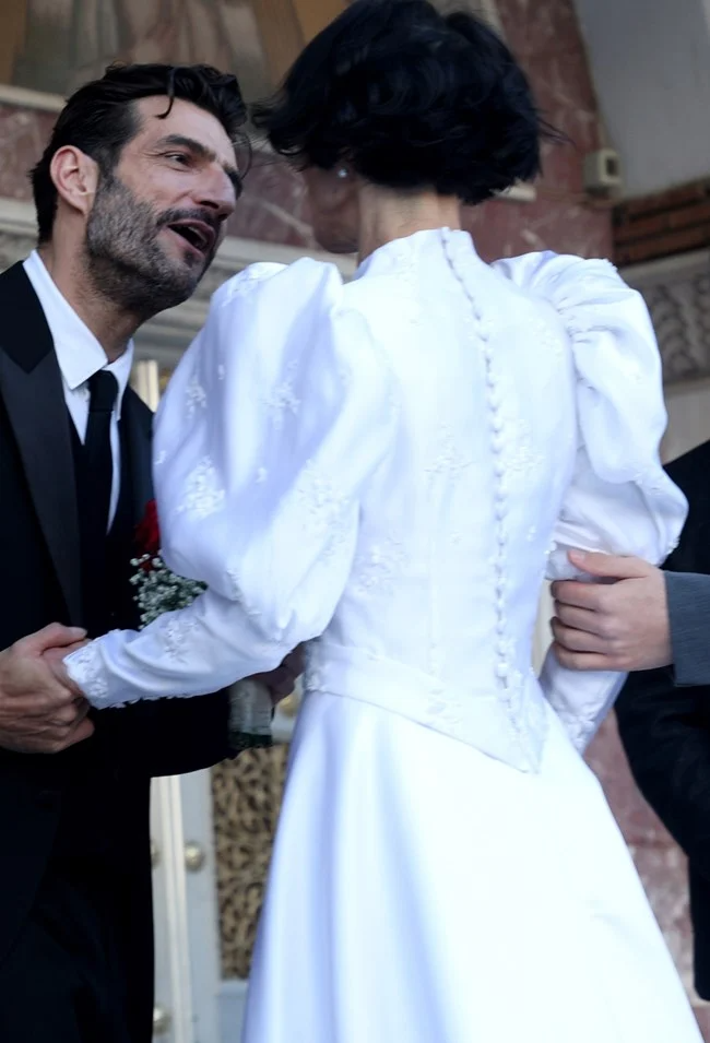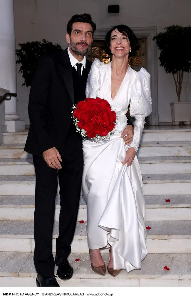 Ειδικότερα, ο γαμπρός έφτασε στον Ιερό Ναό Κοιμήσεως Θεοτόκου, στην Παναγίτσα Παλαιού Φαλήρου, με backback και τη νυφική ανθοδέσμη, από κόκκινα τριαντάφυλλα και γυψοφίλη, στο χέρι, τυλιγμένη σε χαρτί περιτυλίγματος, ενώ η νύφη έφτασε με μαύρο κάμπριο αυτοκίνητο και τον γιο της, ο οποίος έχει απίστευτη ομοιότητα με τον ηθοποιό, να την συνοδεύει στην εκκλησία.