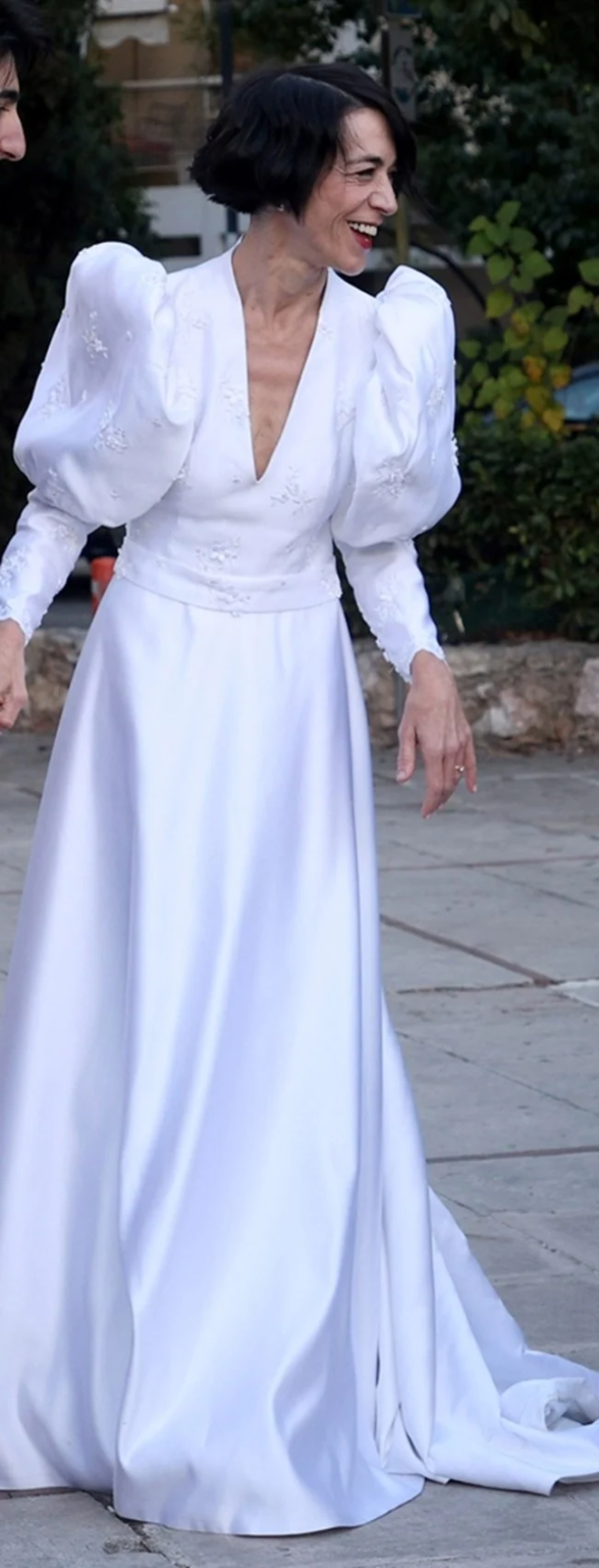Σατέν, βικτωριανό, με φουσκωτά μανίκια: Το παραμυθένιο νυφικό της Έλενας Τοπαλίδου ήταν επιλογή του γαμπρού