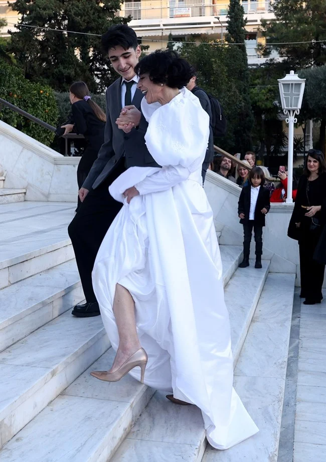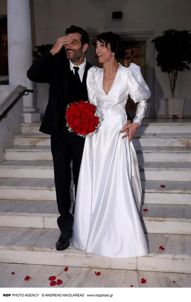 Ειδικότερα, ο γαμπρός έφτασε στον Ιερό Ναό Κοιμήσεως Θεοτόκου, στην Παναγίτσα Παλαιού Φαλήρου, με backback και τη νυφική ανθοδέσμη, από κόκκινα τριαντάφυλλα και γυψοφίλη, στο χέρι, τυλιγμένη σε χαρτί περιτυλίγματος, ενώ η νύφη έφτασε με μαύρο κάμπριο αυτοκίνητο και τον γιο της, ο οποίος έχει απίστευτη ομοιότητα με τον ηθοποιό, να την συνοδεύει στην εκκλησία.