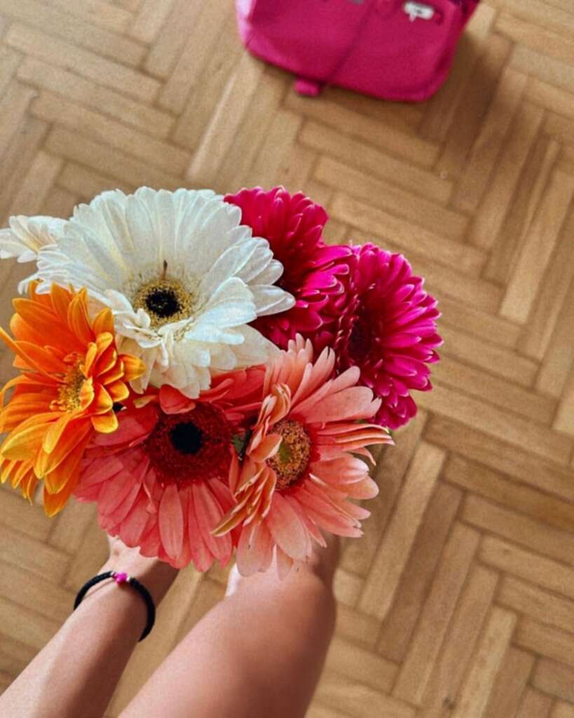 Στην πρώτη φωτογραφία ποζάρει έτσι όπως μόνο εκείνη ξέρει, σαν μοντέλο, μπροστά από έναν καθρέφτη, ντυμένη στα λευκά ενώ στην δεύτερη κρατά ένα μπουκέτο λουλούδια!