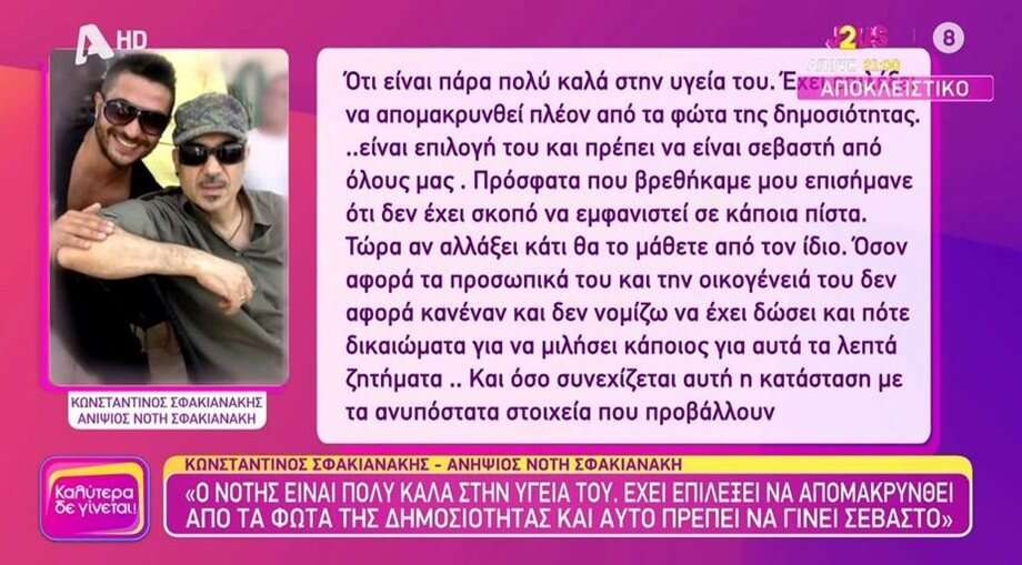 Ο Κωνσταντίνος Σφακιανάκης ανέφερε επίσης για τον θείο του: «Είναι πάρα πολύ καλά στην υγεία του. Έχει επιλέξει πλέον να απομακρυνθεί από τα φώτα της δημοσιότητας. Είναι επιλογή του και πρέπει να είναι σεβαστή από όλους μας. Πρόσφατα που βρεθήκαμε, μου επισήμανε ότι δεν έχει σκοπό να εμφανιστεί σε κάποια πίστα. Αν αλλάξει κάτι, θα το μάθετε από τον ίδιο.