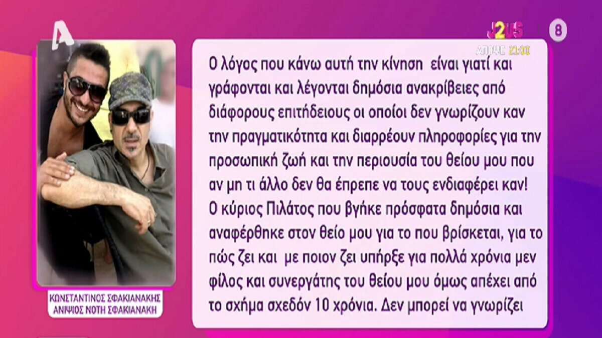 «Γράφονται και λέγονται δημόσια ανακρίβειες από διάφορους επιτήδειους, οι οποίοι δεν γνωρίζουν καν την πραγματικότητα και διαρρέουν πληροφορίες για την προσωπική ζωή και την περιουσία του θείου μου που αν μη τι άλλο δεν θα έπρεπε καν να τους ενδιαφέρει», είπε αρχικά ο Κωνσταντίνος Σφακιανάκης.