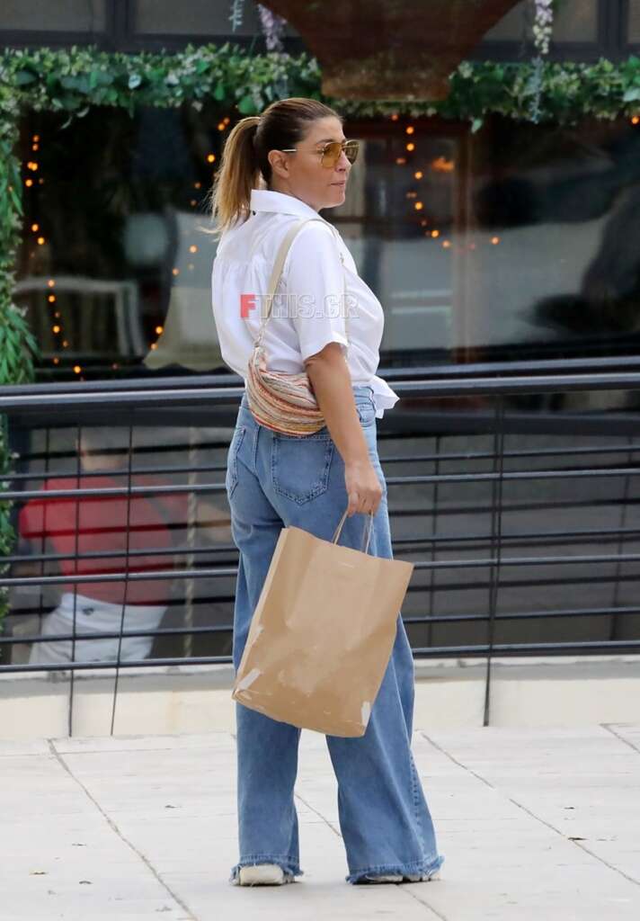 Η τραγουδίστρια ήταν χαλαρή απολαμβάνοντας τη μέρα της και χαζεύοντας τις βιτρίνες. Για την χαλαρή βόλτα της επέλεξε ένα άνετο και κομψό σύνολο που απαρτιζόταν από wide leg denim παντελόνι και λευκό πουκάμισο. Το σύνολο της ολοκλήρωσε με sneakers σε λευκό χρώμα.