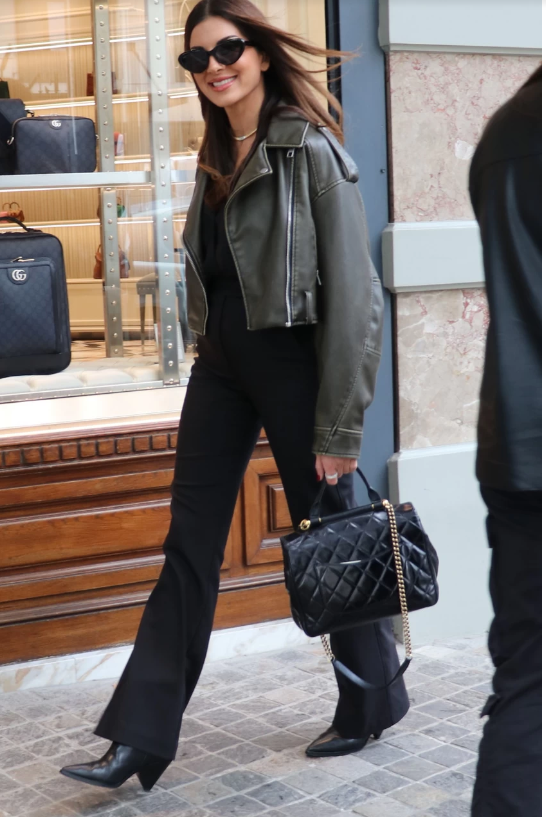 Ολοκλήρωσε το σύνολο με μαύρα γυαλιά ηλίου, τσάντα με καπιτονέ σχέδιο τύπου Chanel και μπότες σε western στυλ με ιδιαίτερα τακούνια.