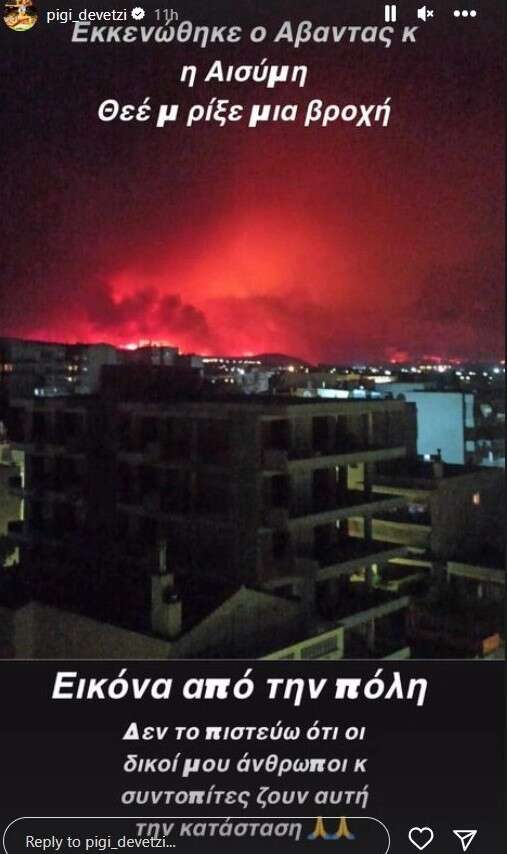 «Εκκενώθηκε ο Άβαντας και η Αισύμη. Θεέ μου ρίξε μια βροχή. Εικόνα από την πόλη. Δεν το πιστεύω ότι οι δικοί μου άνθρωποι και συντοπίτες ζουν αυτή την κατάσταση», έγραψε ενώ ανέβασε σχετικές εικόνες από το σπίτι του αδερφού της.
