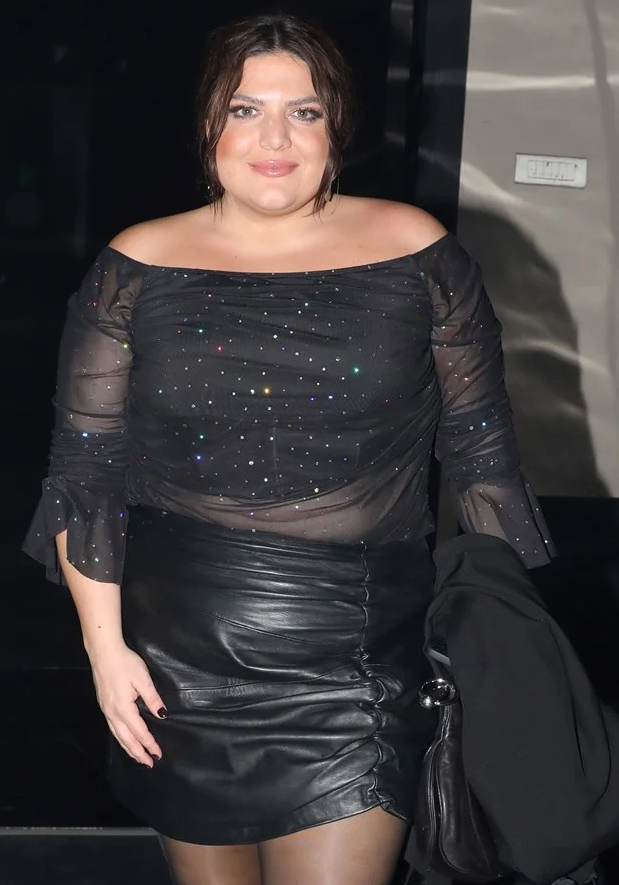 Η Δανάη Μπάρκα φόρεσε μια δερμάτινη ντραπέ μίνι φούστα και ένα έξωμο τοπ με στρας και διαφάνειες.