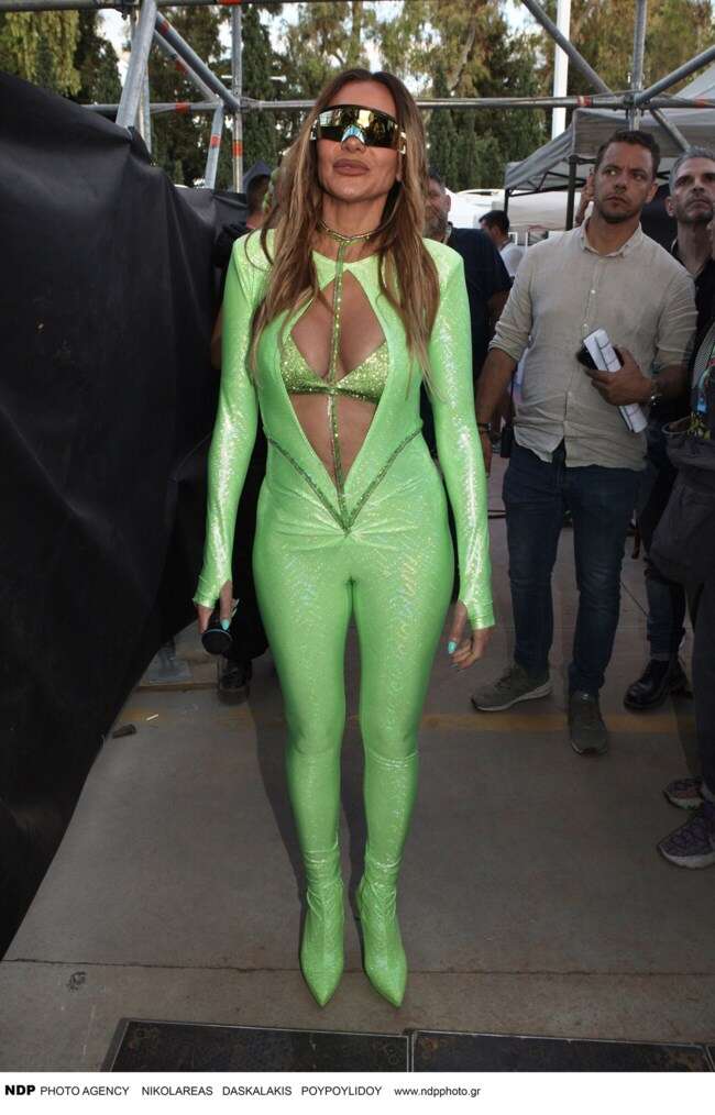 Ειδικότερα, η τραγουδίστρια φόρεσε μια neon ολόσωμη φόρμα, με άνοιγμα στο στήθος και glam bra top στο ίδιο χρώμα, με την υπογραφή της Celia Kritharioti. Την εμφάνισή της ολοκλήρωσε με τεράστια γυαλιά ηλίου και νύχια σε έντονο τιρκουάζ χρώμα.