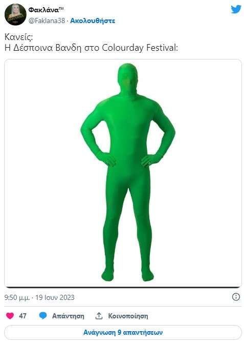Η Δέσποινα Βανδή εμφανίστηκε στο Colourday Festival με μια ενδυματολογική επιλογή που δεν πέρασε απαρατήρητη. Η εμφάνιση της τραγουδίστριας, το απόγευμα της Κυριακής στο ΟΑΚΑ με neon ολόσωμη φόρμα προκάλεσε σχόλια στο Twitter.