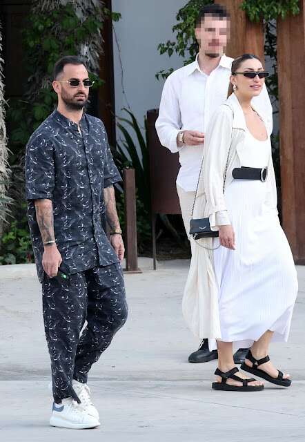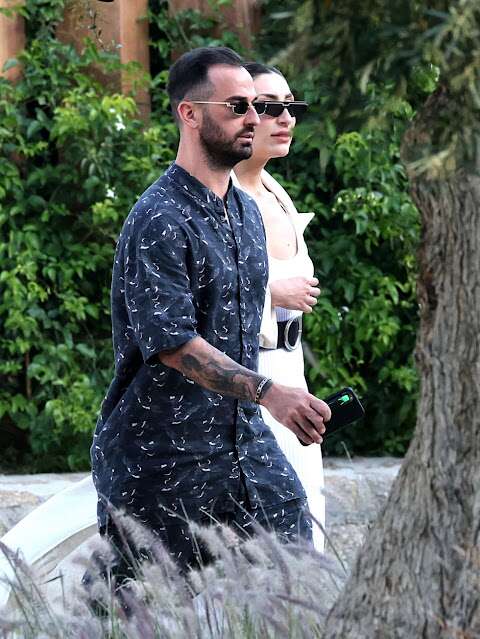 Εκείνος φορούσε ένα σετ πουκάμισο – παντελόνι, σε μαύρο χρώμα με σχέδια πάνω, ενώ εκείνη είχε ντυθεί στα λευκά. Φορούσε ένα φόρεμα σχετικά αέρινο, το οποίο είχε συνδυάσει με μαύρη ζώνη και πέδιλα, ενώ από πάνω – γιατί είναι και το νησί των ανέμων – φορούσε μία μπεζ καπαρντίνα. Είχε πιάσει τα μαλλιά της κοτσίδα, ενώ στο πρόσωπό της είχε επιλέξει να βάλει γυαλιά ηλίου. Οι δυο τους περπατούσαν ανενόχλητοι, χωρίς να ενδιαφέρονται για τα αδιάκριτα βλέμματα και τα φλας.