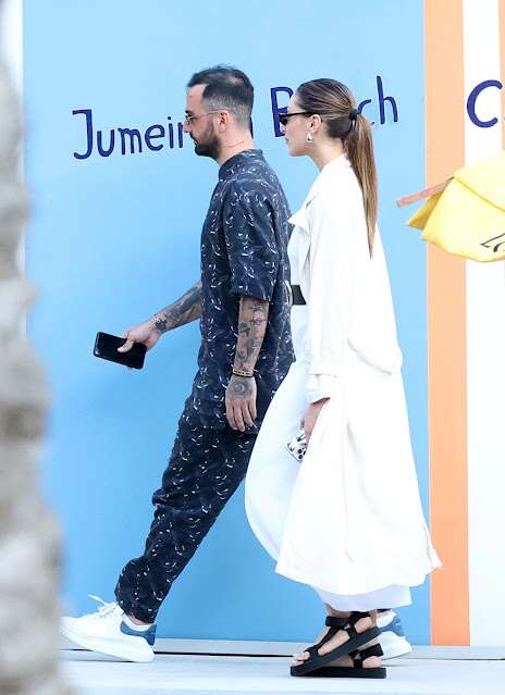 Εκείνος φορούσε ένα σετ πουκάμισο – παντελόνι, σε μαύρο χρώμα με σχέδια πάνω, ενώ εκείνη είχε ντυθεί στα λευκά. Φορούσε ένα φόρεμα σχετικά αέρινο, το οποίο είχε συνδυάσει με μαύρη ζώνη και πέδιλα, ενώ από πάνω – γιατί είναι και το νησί των ανέμων – φορούσε μία μπεζ καπαρντίνα. Είχε πιάσει τα μαλλιά της κοτσίδα, ενώ στο πρόσωπό της είχε επιλέξει να βάλει γυαλιά ηλίου. Οι δυο τους περπατούσαν ανενόχλητοι, χωρίς να ενδιαφέρονται για τα αδιάκριτα βλέμματα και τα φλας.