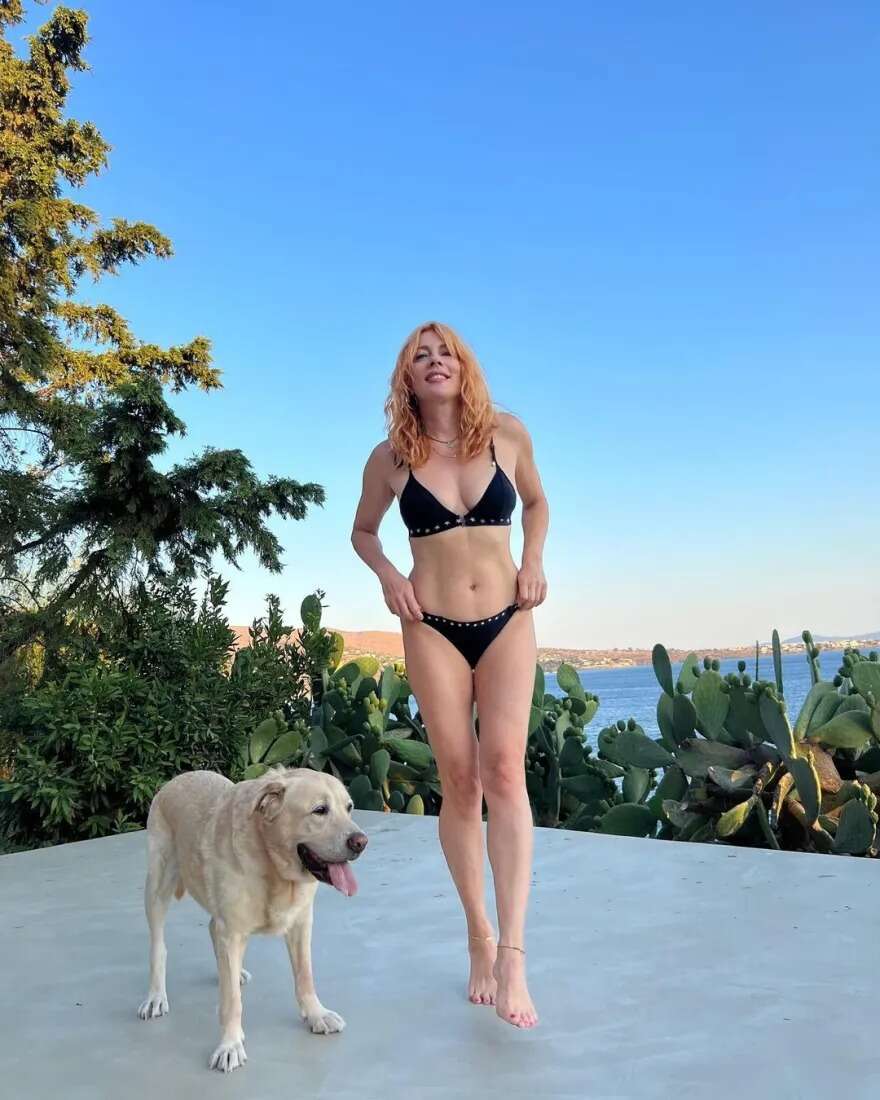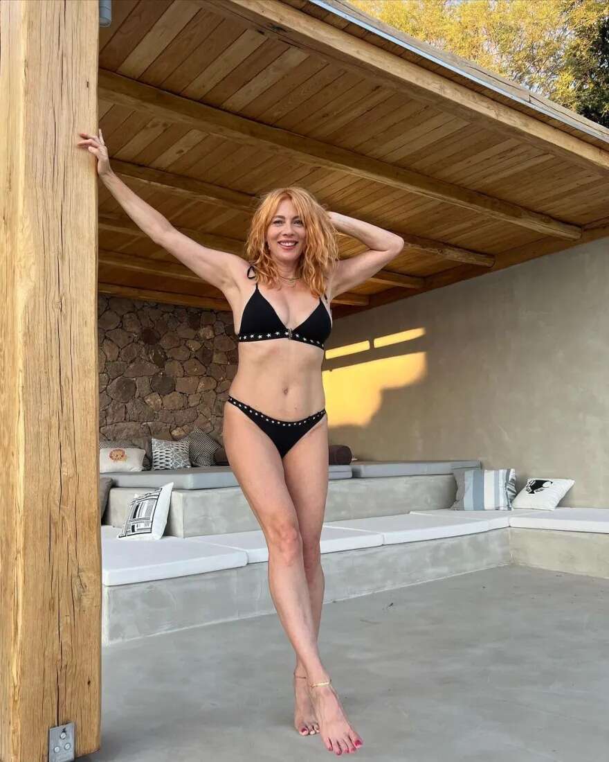 Φορώντας ένα μαύρο μπικίνι, η ηθοποιός χοροπηδά στον αέρα και χαμογελά στην κάμερα που την καταγράφει, κρατώντας παράλληλα, μια μπλε πετσέτα θαλάσσης.
