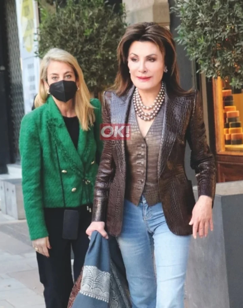 Συγκεκριμένα, φόρεσε ανοιχτόχρωμο τζιν παντελόνι, το οποίο συνδύασε με δερμάτινο κροκό γιλέκο και ασορτί σακάκι υιοθετώντας την leather on leather τάση της σεζόν. Στον λαιμό της φόρεσε πέρλες κράτησε μια καφέ δερμάτινη τσάντα.
